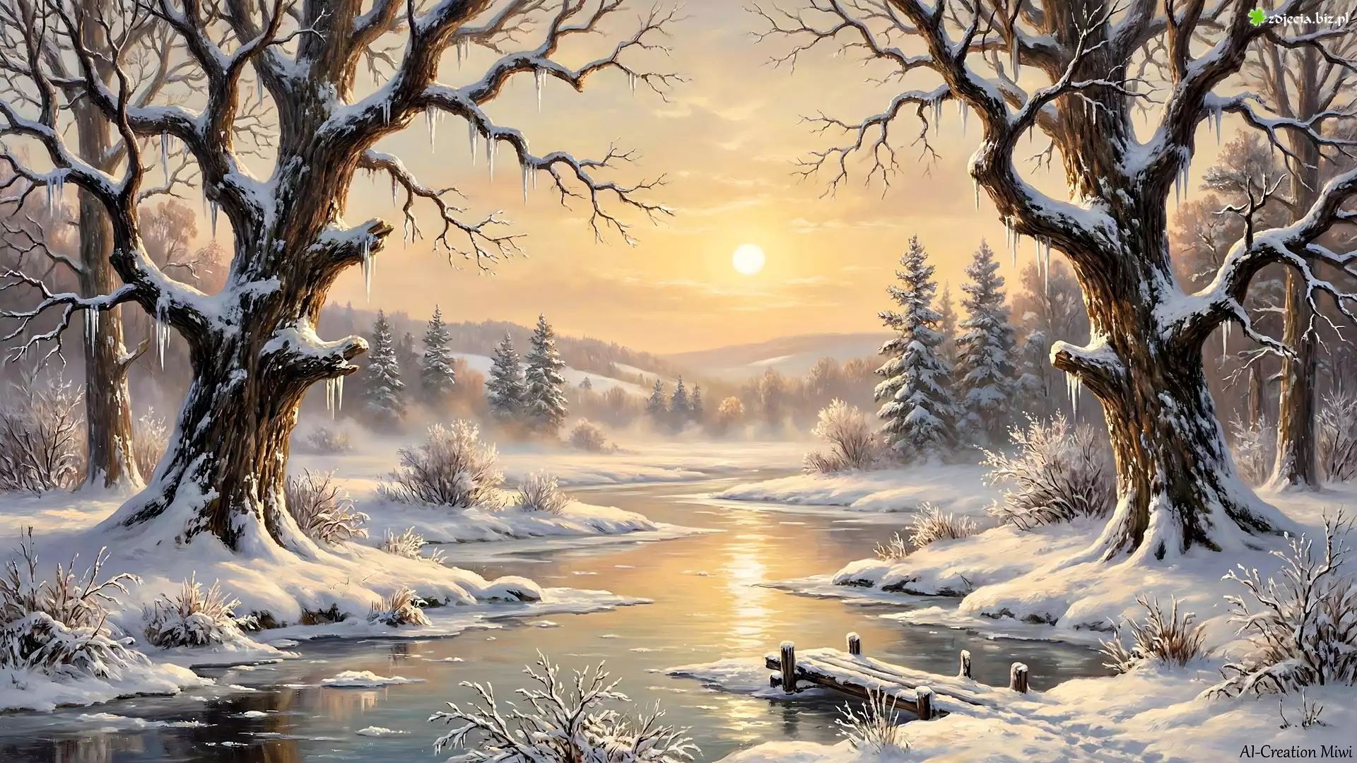 Zdjęcie Zima, Rzeka, Drzewa, Słońce, Grafika, AI