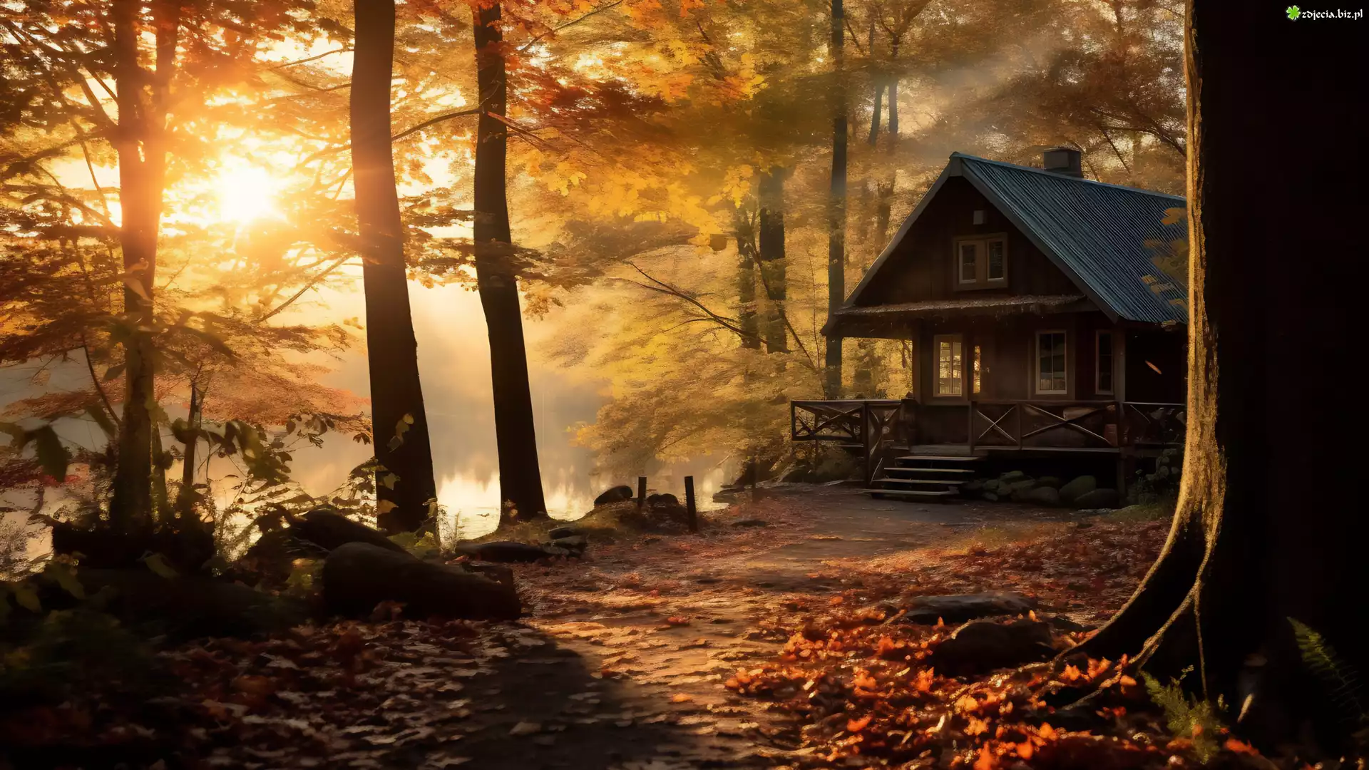 Zdjęcie Jesień, Las, Drzewa, Dom, Liście, Staw, Mgła, Słońce