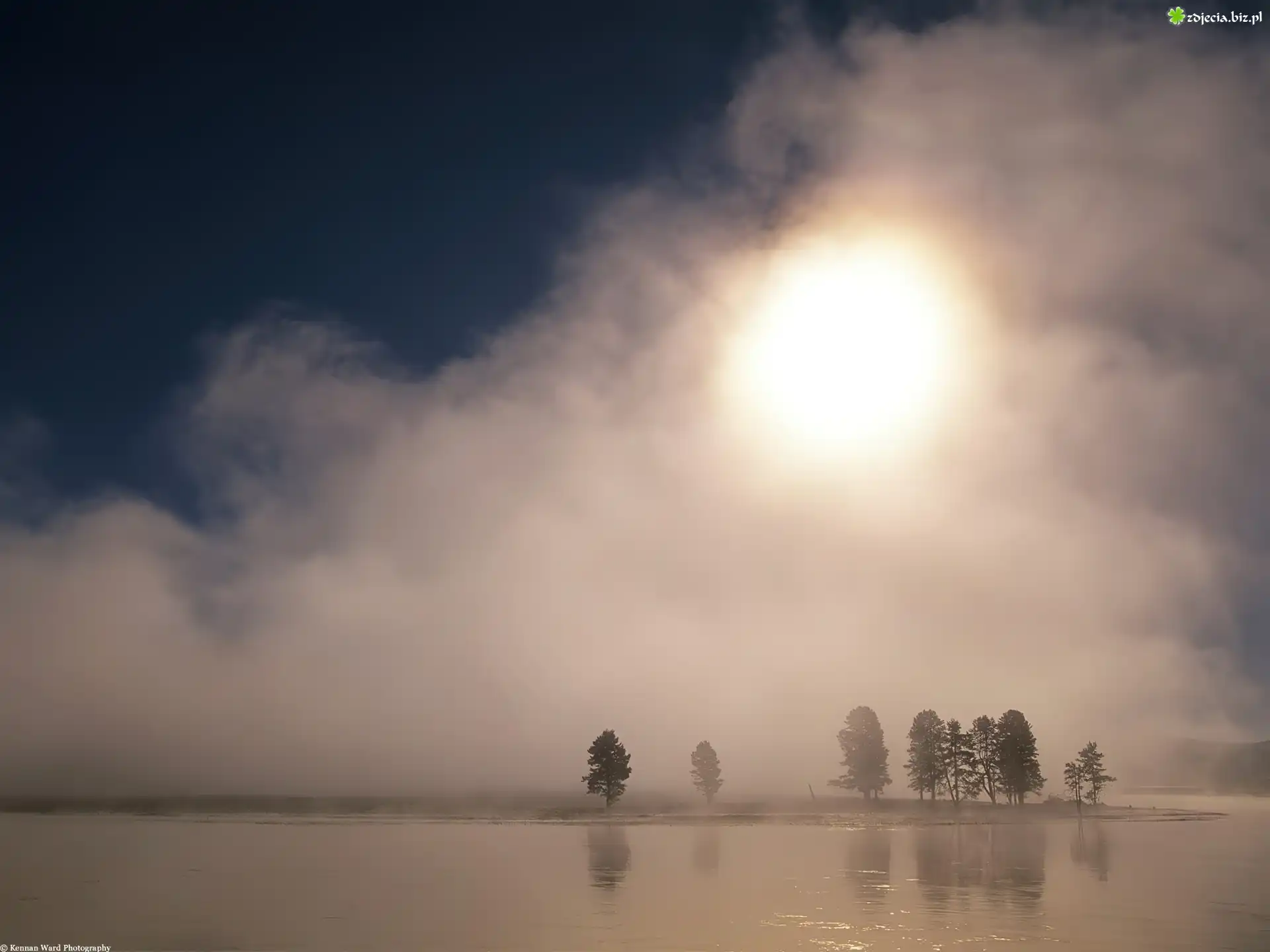 Zdjęcie Słońce, Za, Chmurami, Jezioro, Drzewa