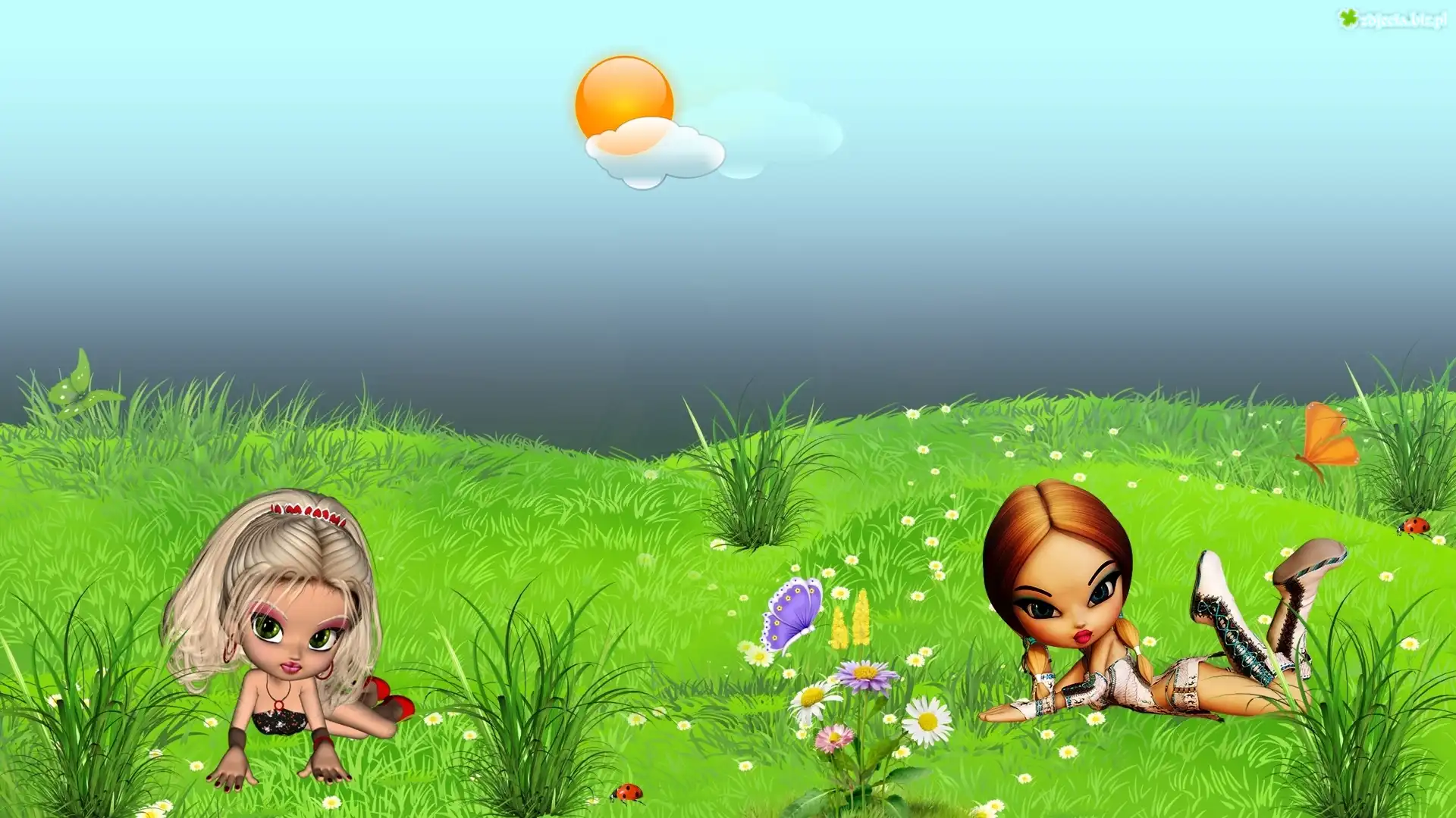 Zdjęcie Łąka, Kwiaty, Motylki, Słońce, Laleczki