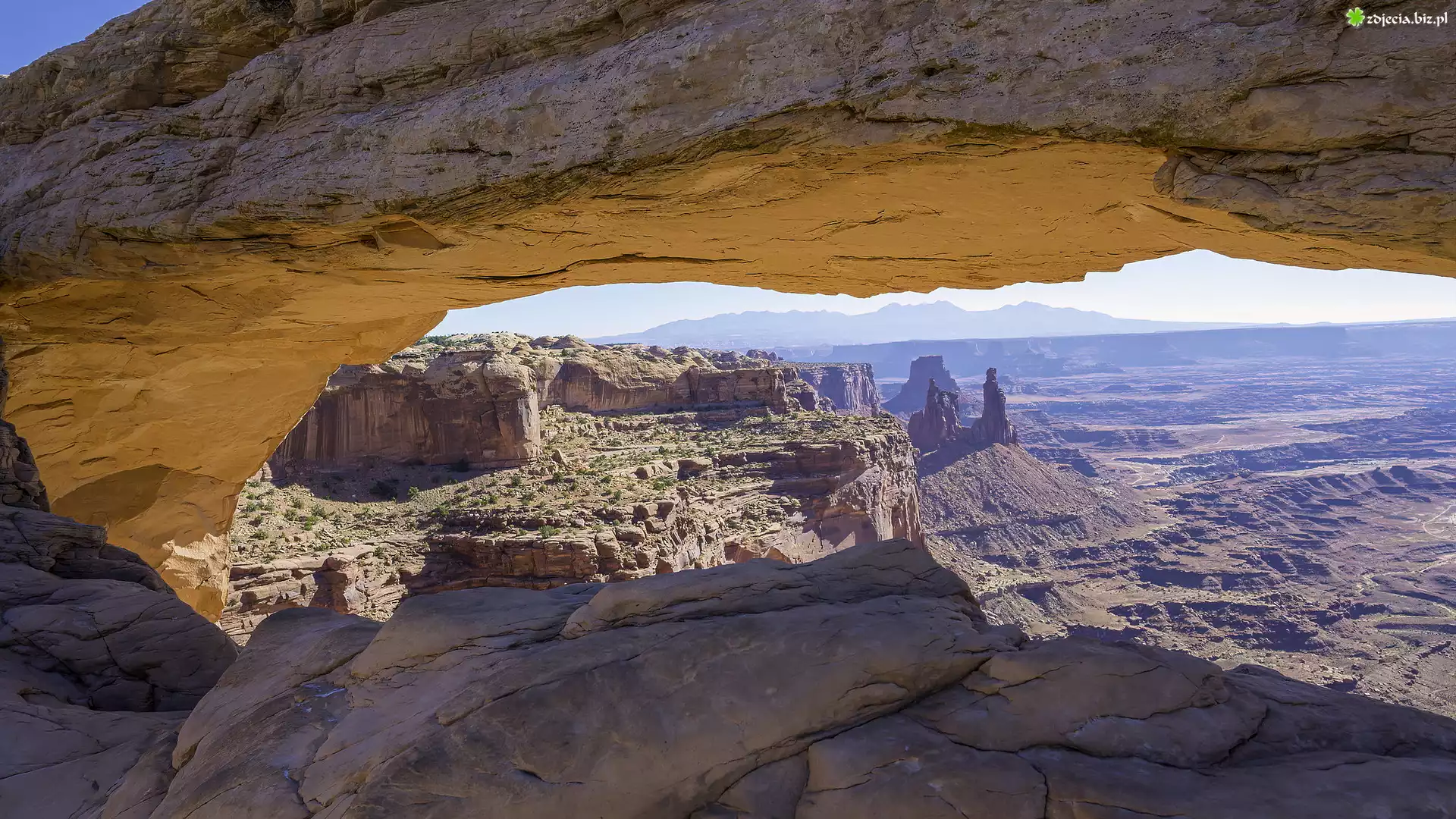 Zdjęcie, Skały, Góry, Słońce, Roślinność, Park Narodowy Canyonlands, Stan Utah, Stany Zjednoczone