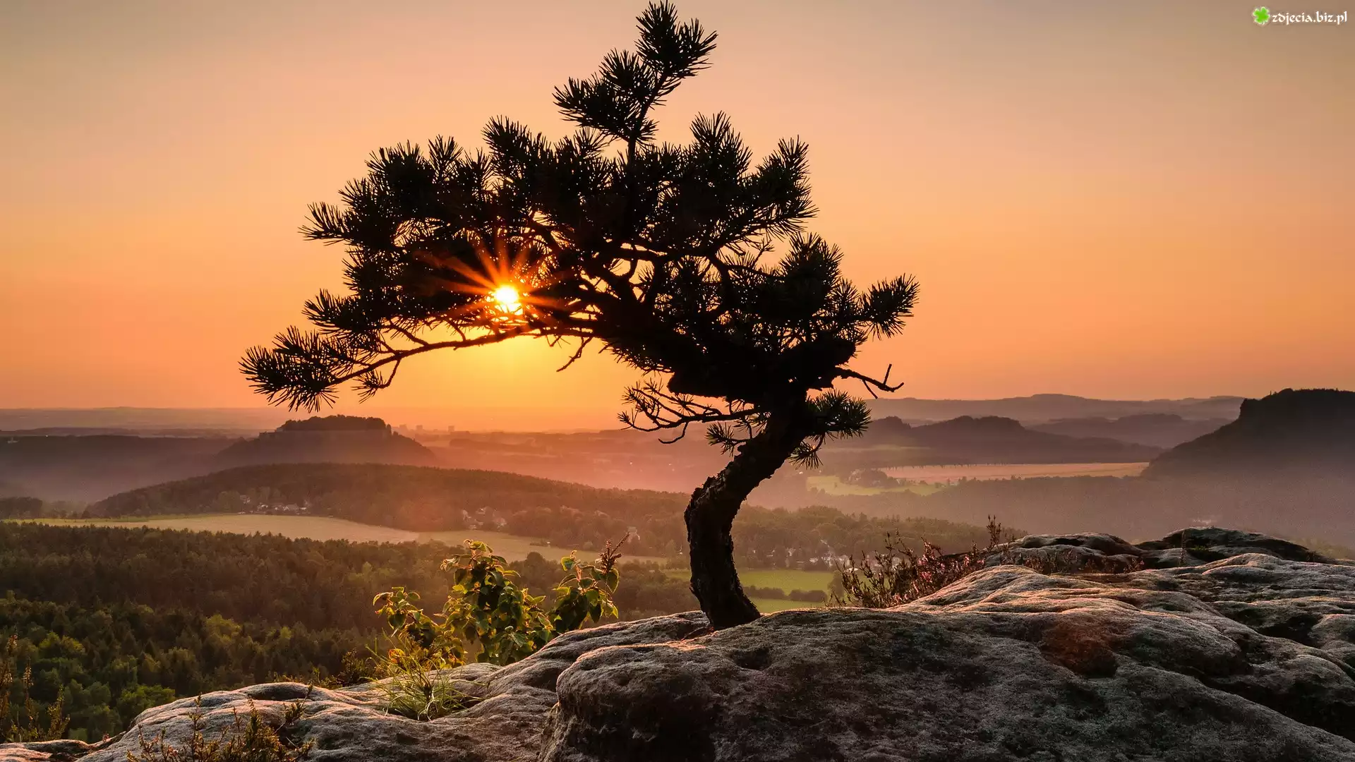 Zdjęcie Słońce, Góry, Mgła, Drzewo, Sosna, Skały