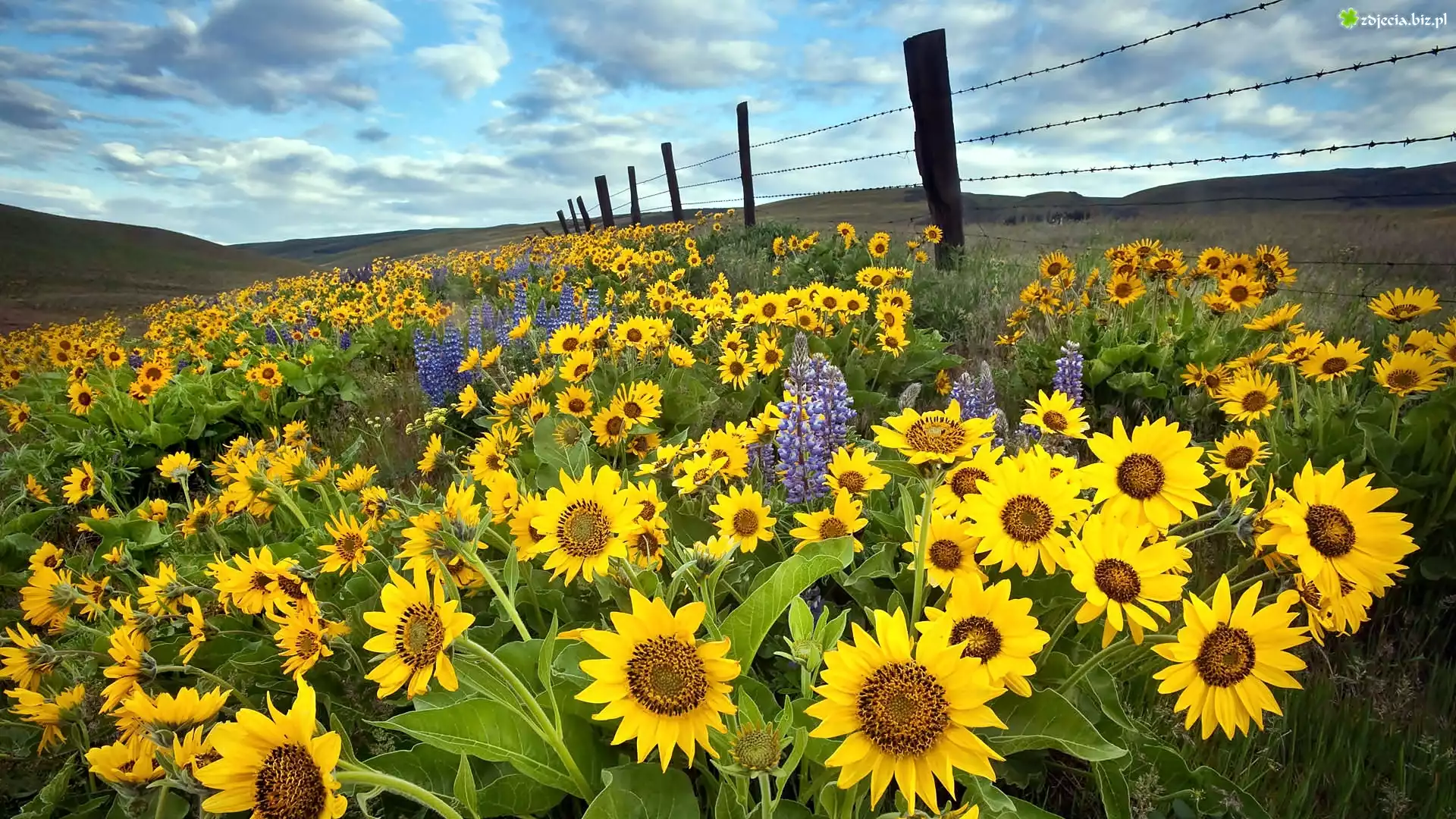 Zdjęcie Łąka, Słoneczniki, Ogrodzenie