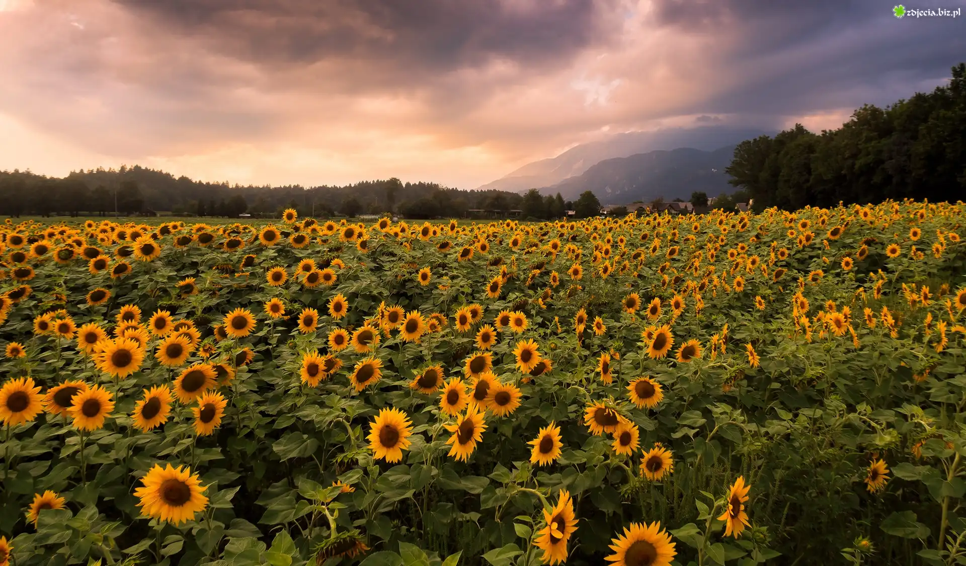 Zdjęcie Słoneczniki, Plantacja, Drzewa, Chmury