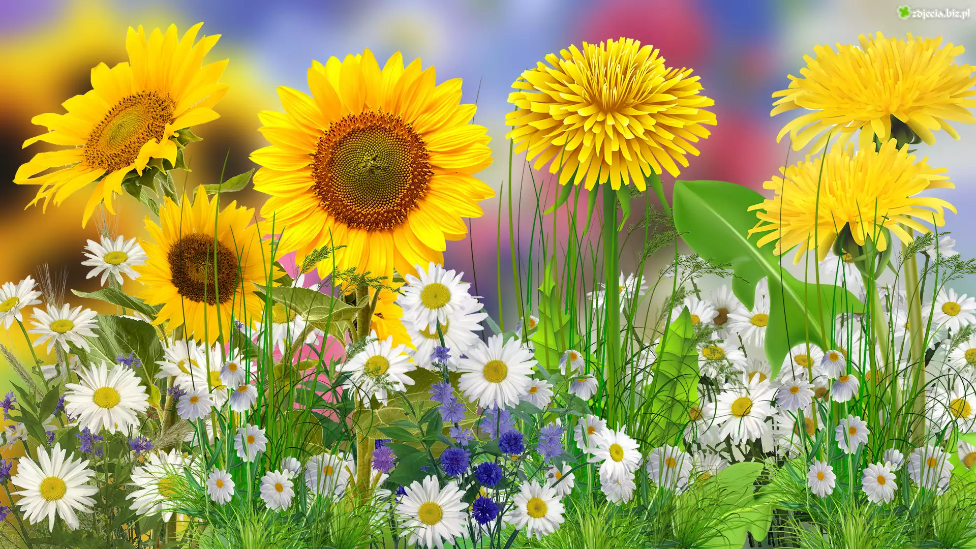 Zdjęcie Kwiaty, Słoneczniki, Stokrotki, Mniszki, 2D