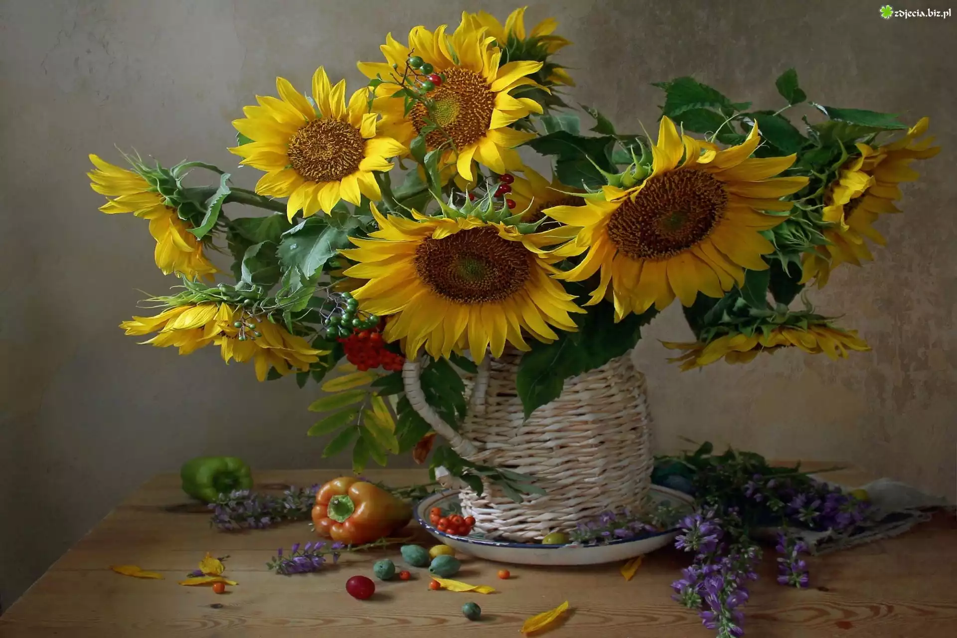 Zdjęcie Kwiaty, Słoneczniki, Wiklinowy, Dzban, Kompozycja