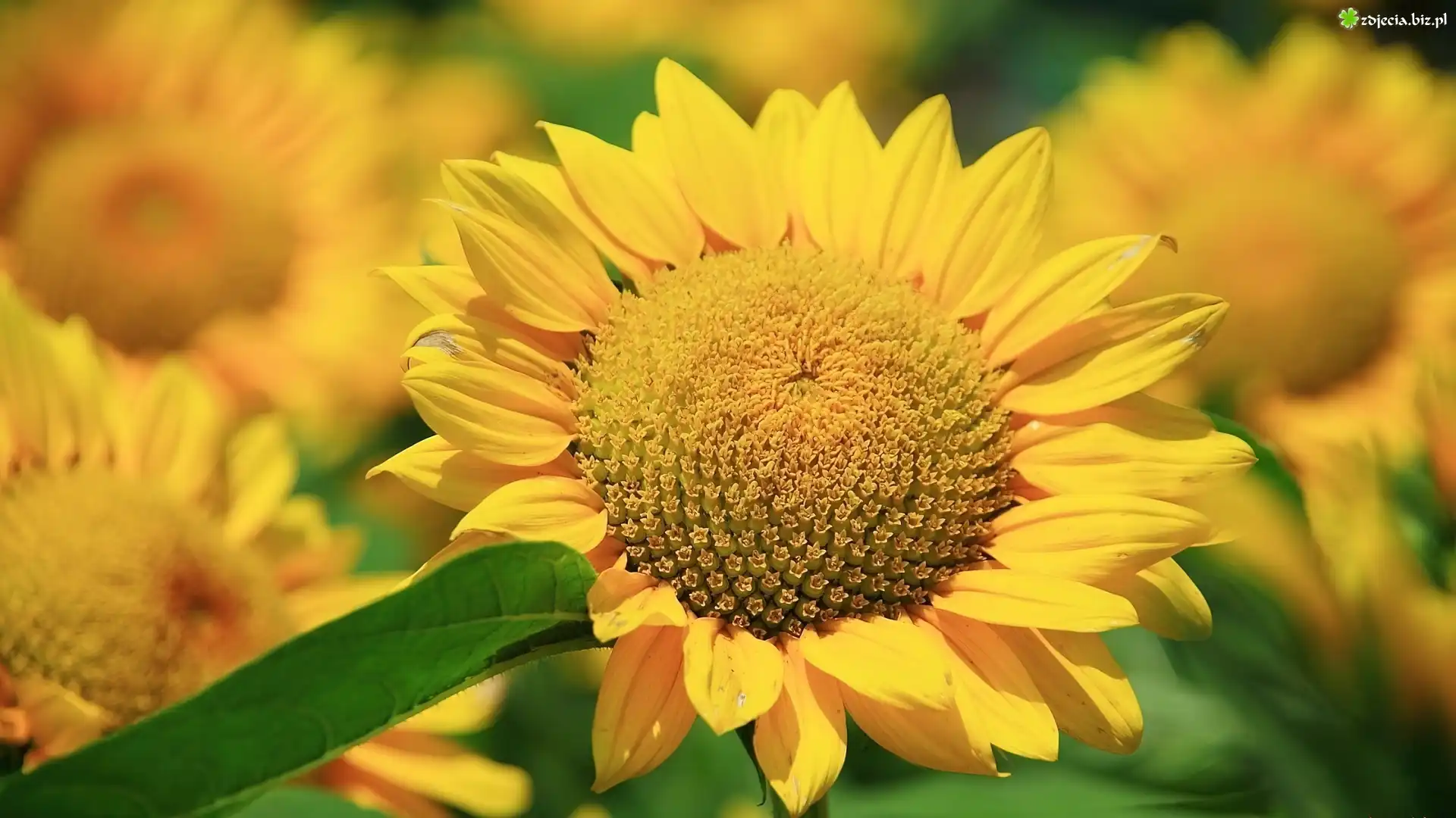 Zdjęcie Słoneczniki, Żółte, Płatki, Zielony, Liść