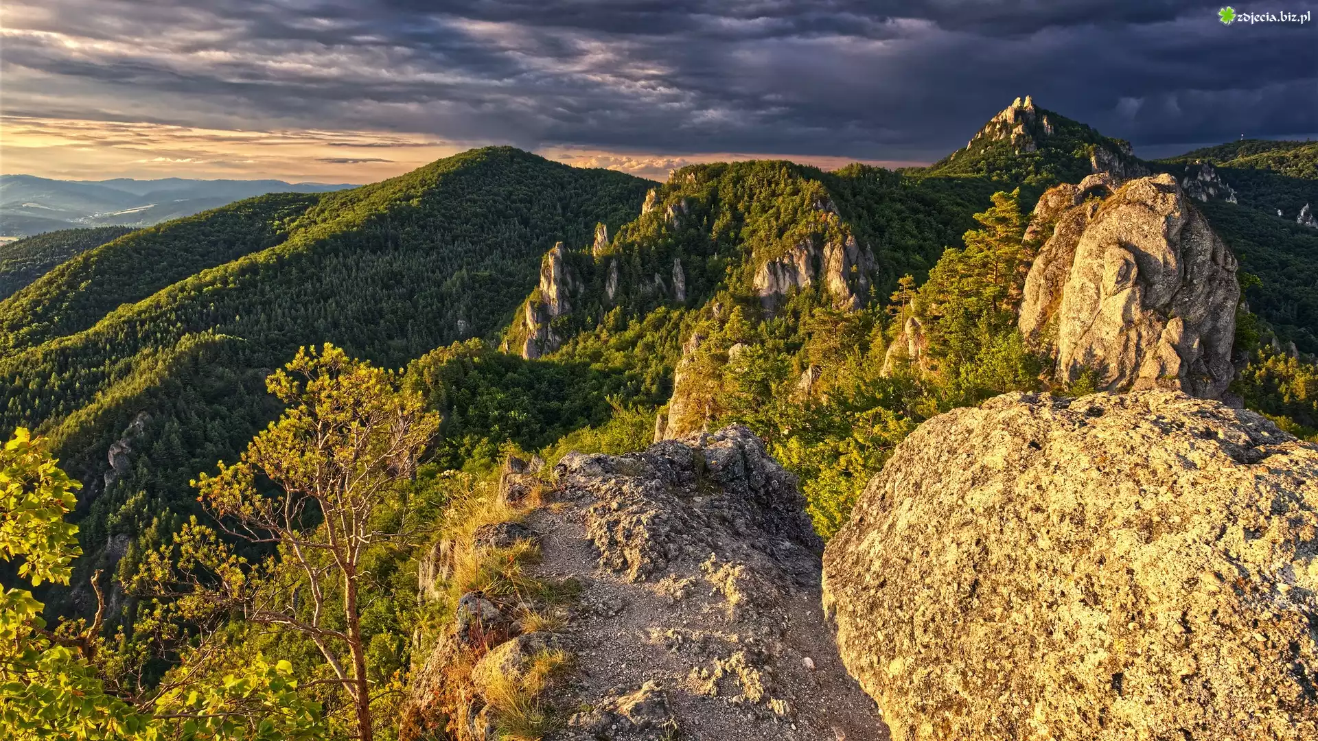 Zdjęcie Góry Strażowskie, Skały, Sulovskie skały, Ciemne, Chmury, Drzewa, Słowacja