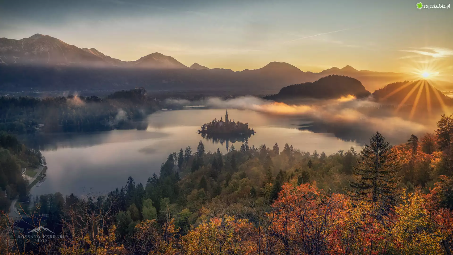 Zdjęcie Słowenia, Wyspa Blejski Otok, Góry Alpy Julijskie, Jezioro Bled, Promienie słońca, Chmury, Drzewa, Jesień, Mgła |