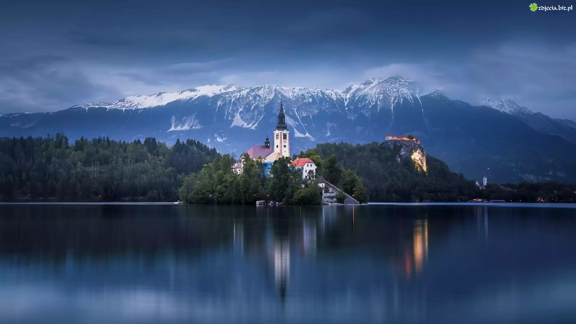 Zdjęcie Słowenia, Wyspa Blejski Otok, Jezioro Bled, Kościół Wniebowzięcia Marii Panny, Góry, Drzewa, Wieczór |