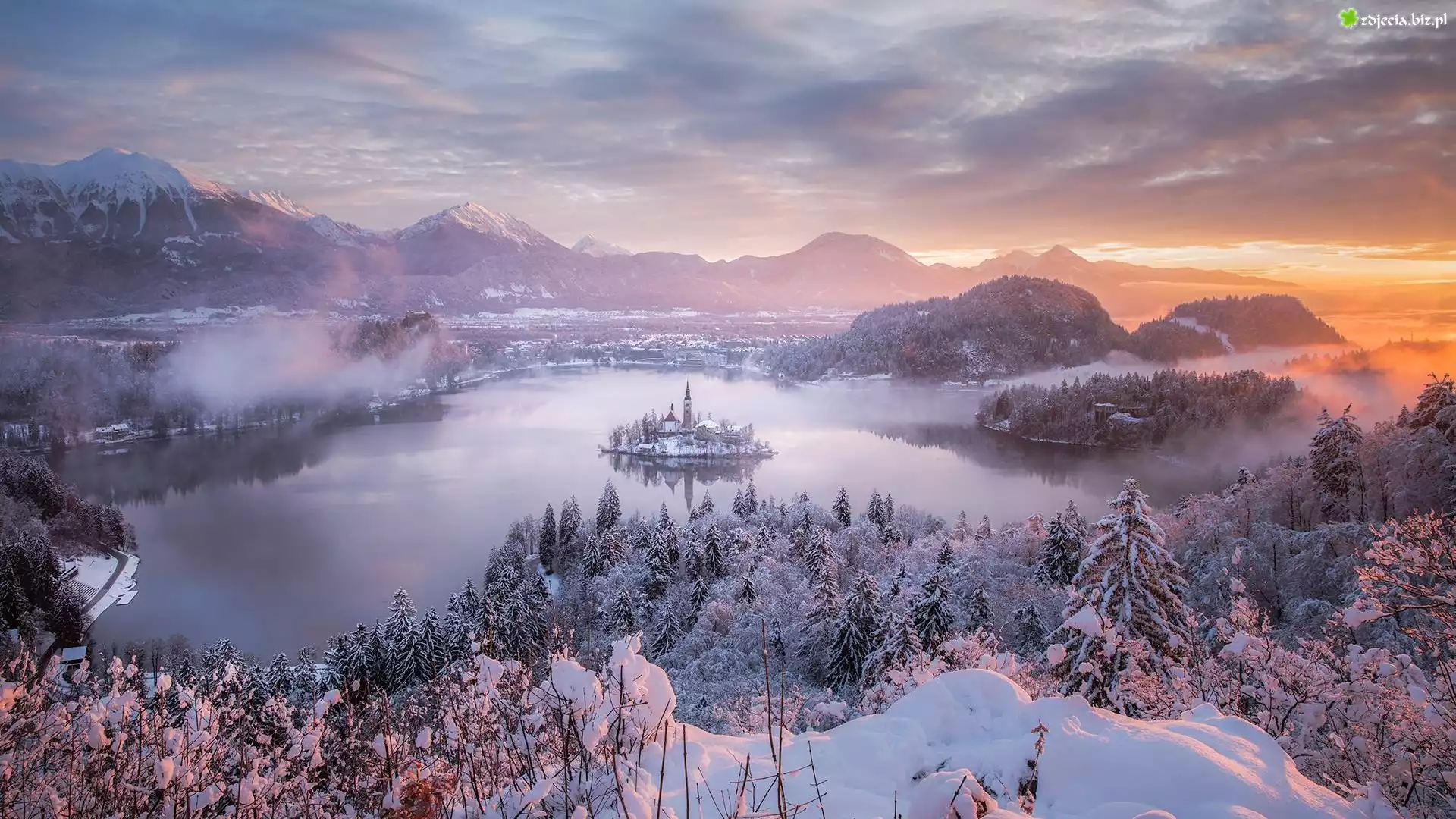Zdjęcie Słowenia, Wyspa Blejski Otok, Góry, Alpy Julijskie, Jezioro Bled, Lasy, Mgła, Chmury, Drzewa, Roślinność, Zima |