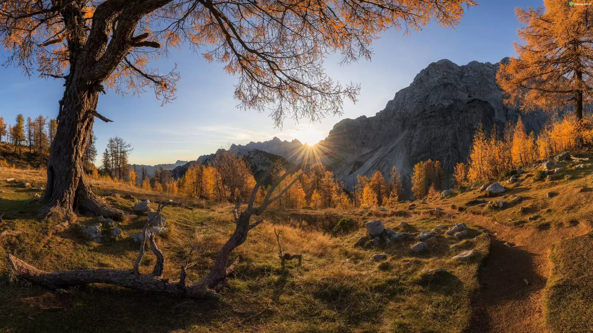 Zdjęcie, Góry, Alpy Julijskie, Szczyt Slemenova Spica, Jesień, Drzewa, Ścieżka, Słowenia