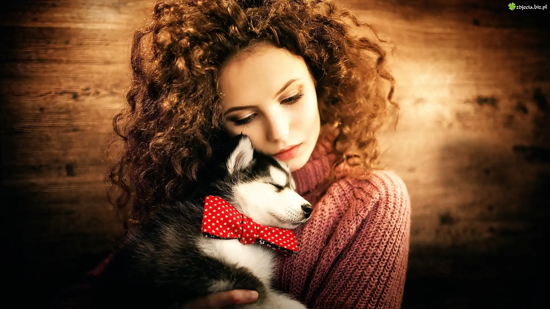 Zdjęcie Młoda, Smutna, Dziewczyna, Szczeniaczek, Husky, Kolorowa, Muszka