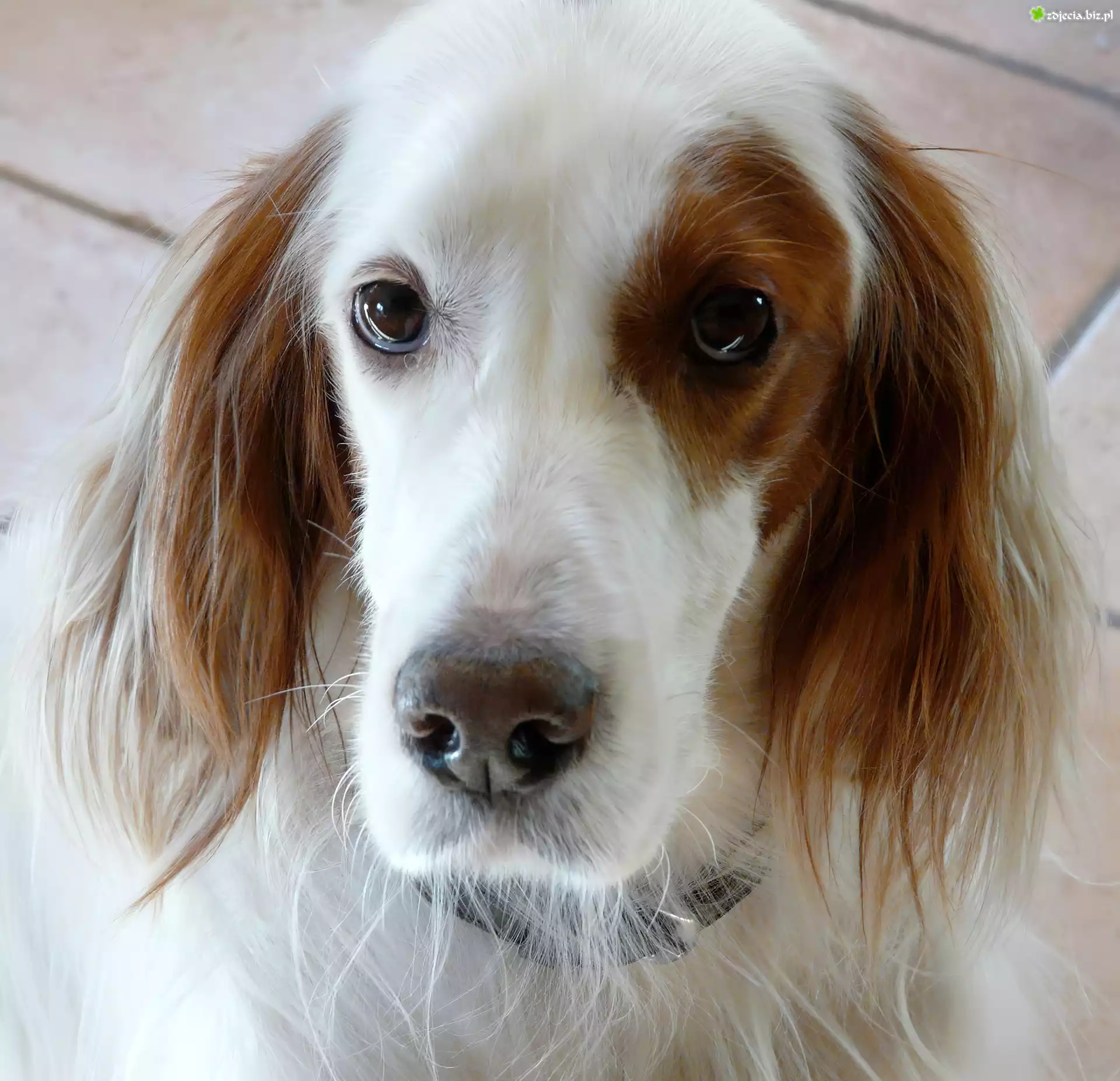 Zdjęcie, smutne, oczy, Seter irlandzki czerwono-biały