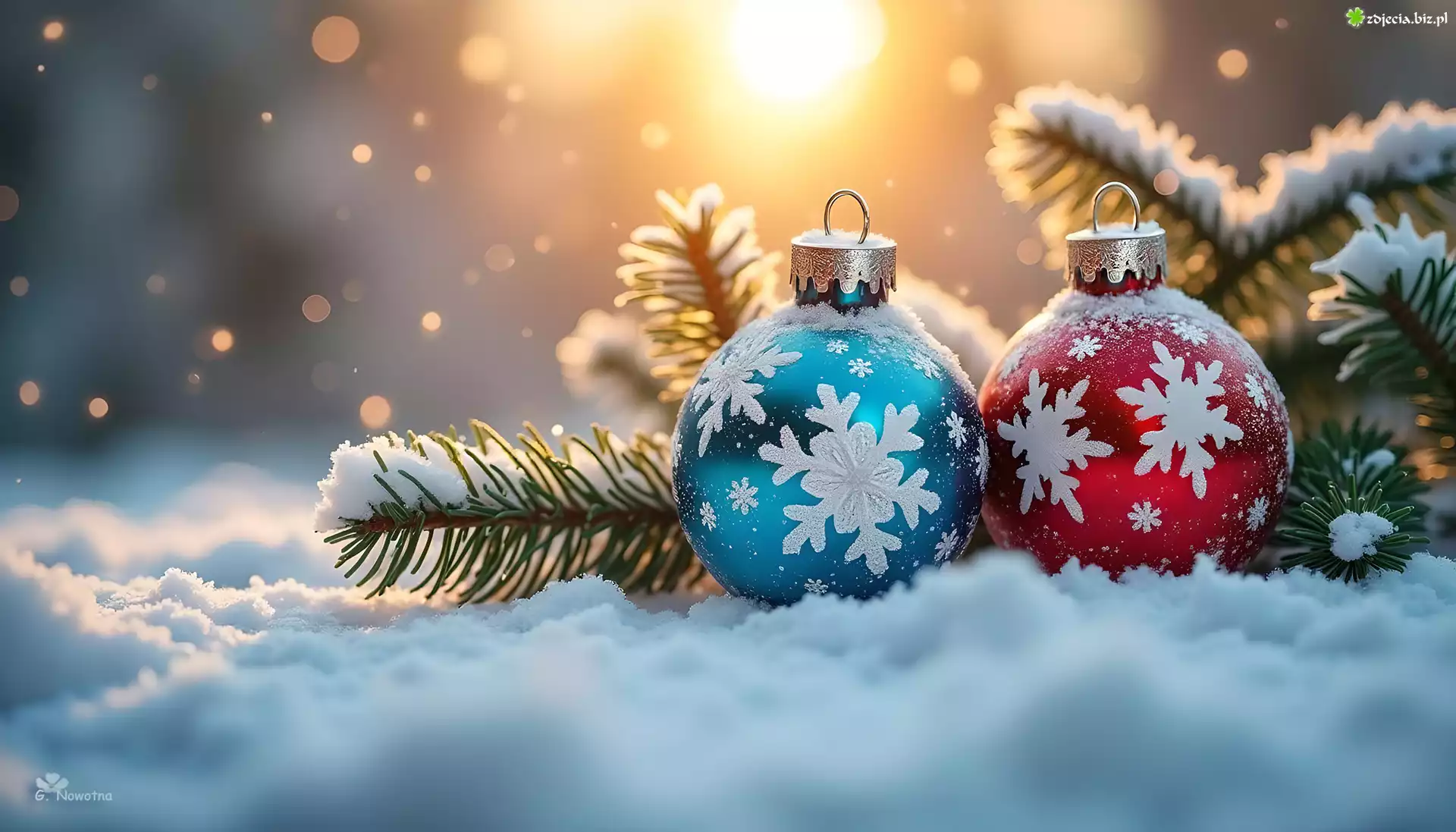 Zdjęcie Boże Narodzenie, Bombki, Śnieg, Gałązki, Świerkowe, Grafika