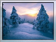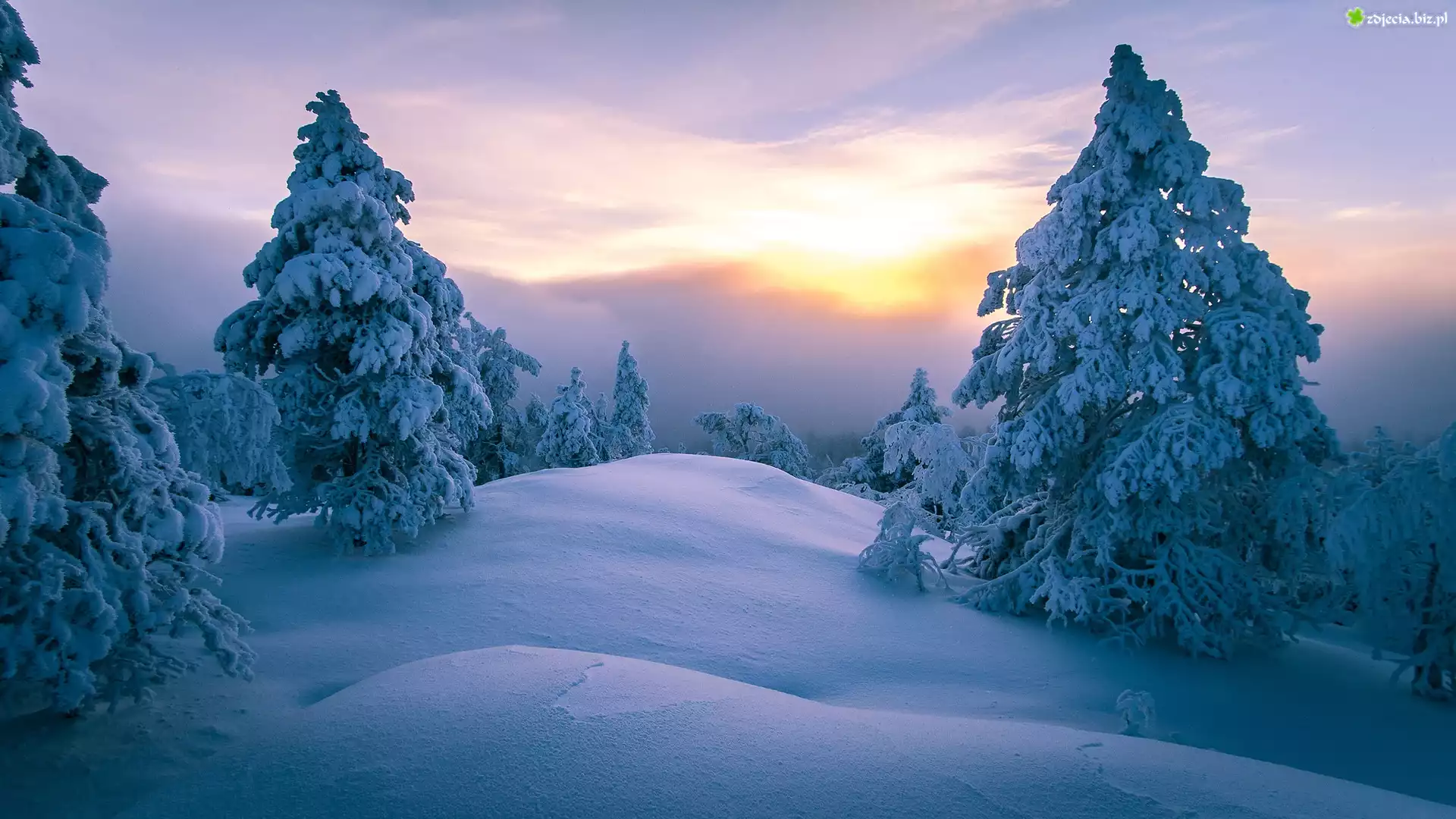 Zdjęcie Zima, Las, Drzewa, Śnieg, Zaspy, Zachód słońca