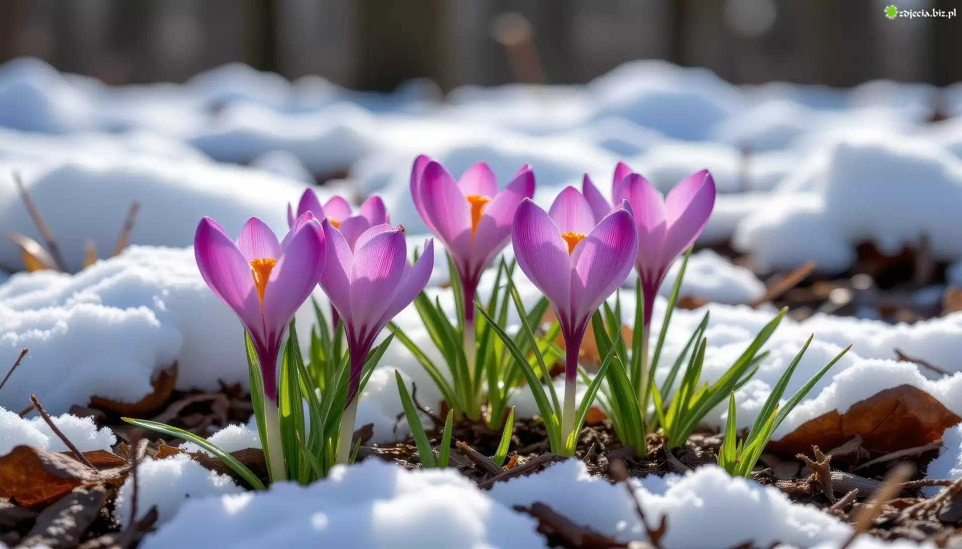 Zdjęcie Fioletowe, Rozświetlone, Krokusy, Śnieg