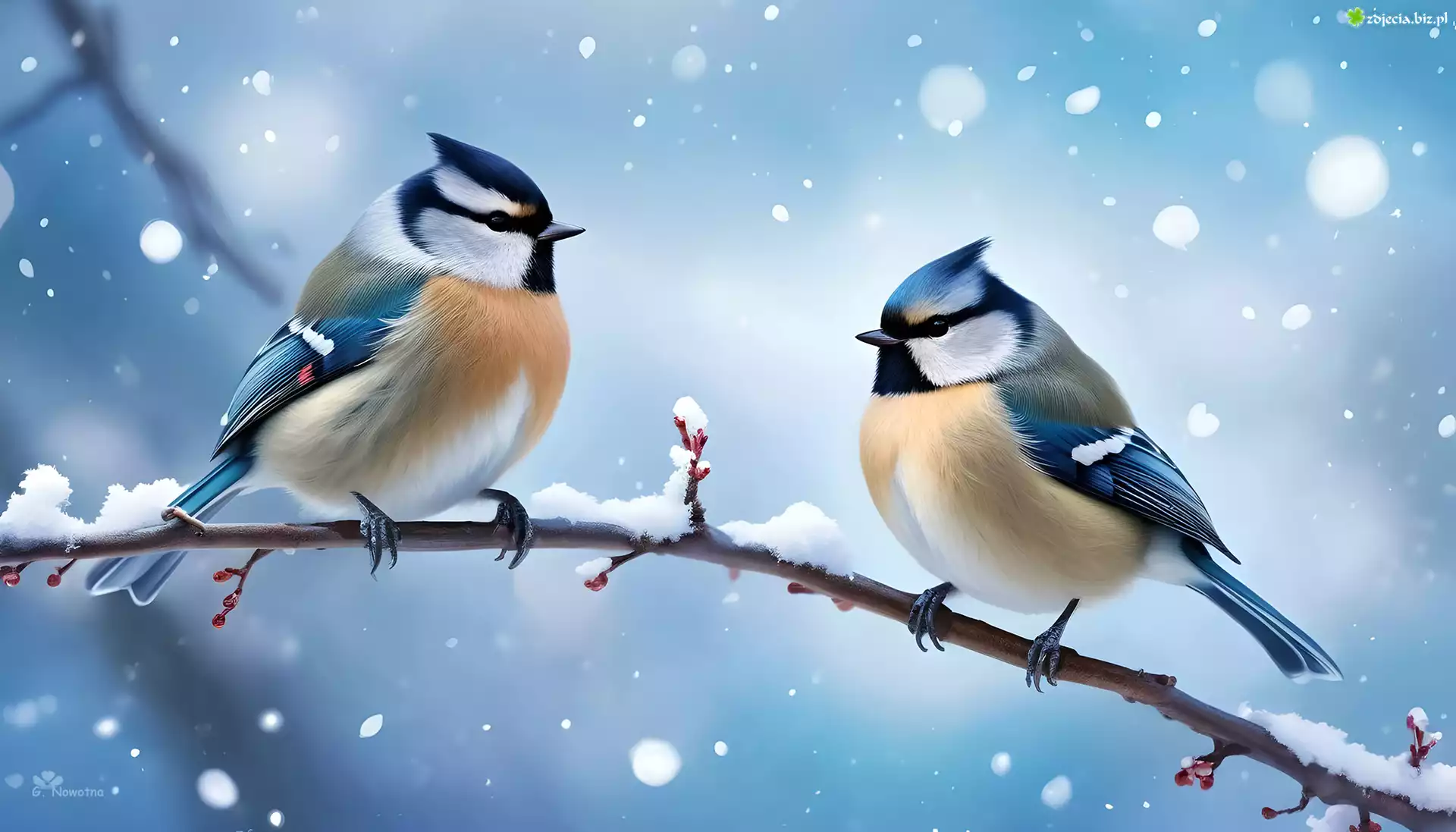 Zdjęcie Dwie, Sikorki, Gałązka, Śnieg, Zima, Grafika