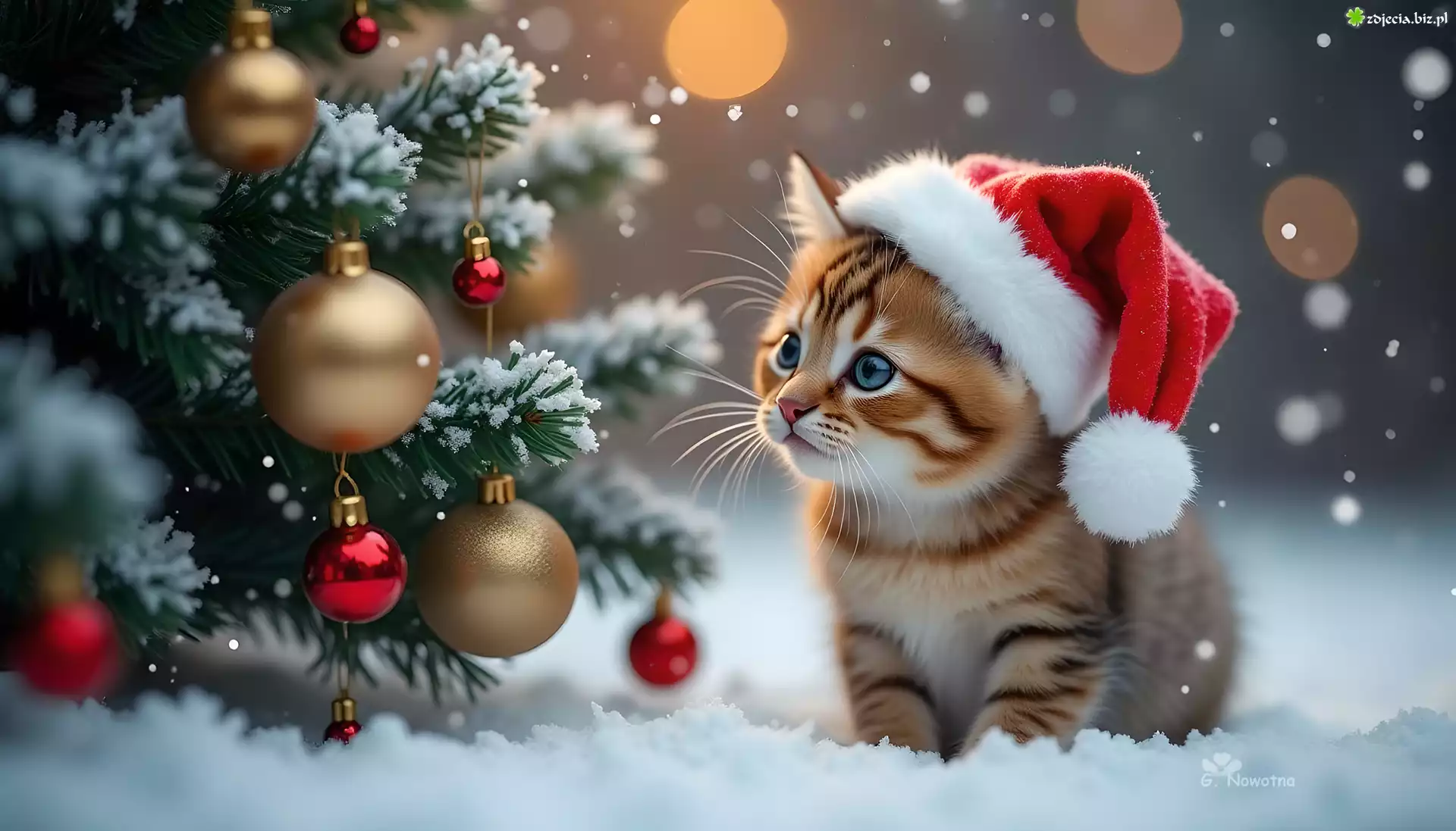 Zdjęcie Kot, Czapka, Mikołaja, Śnieg, Choinka, Zima, Grafika