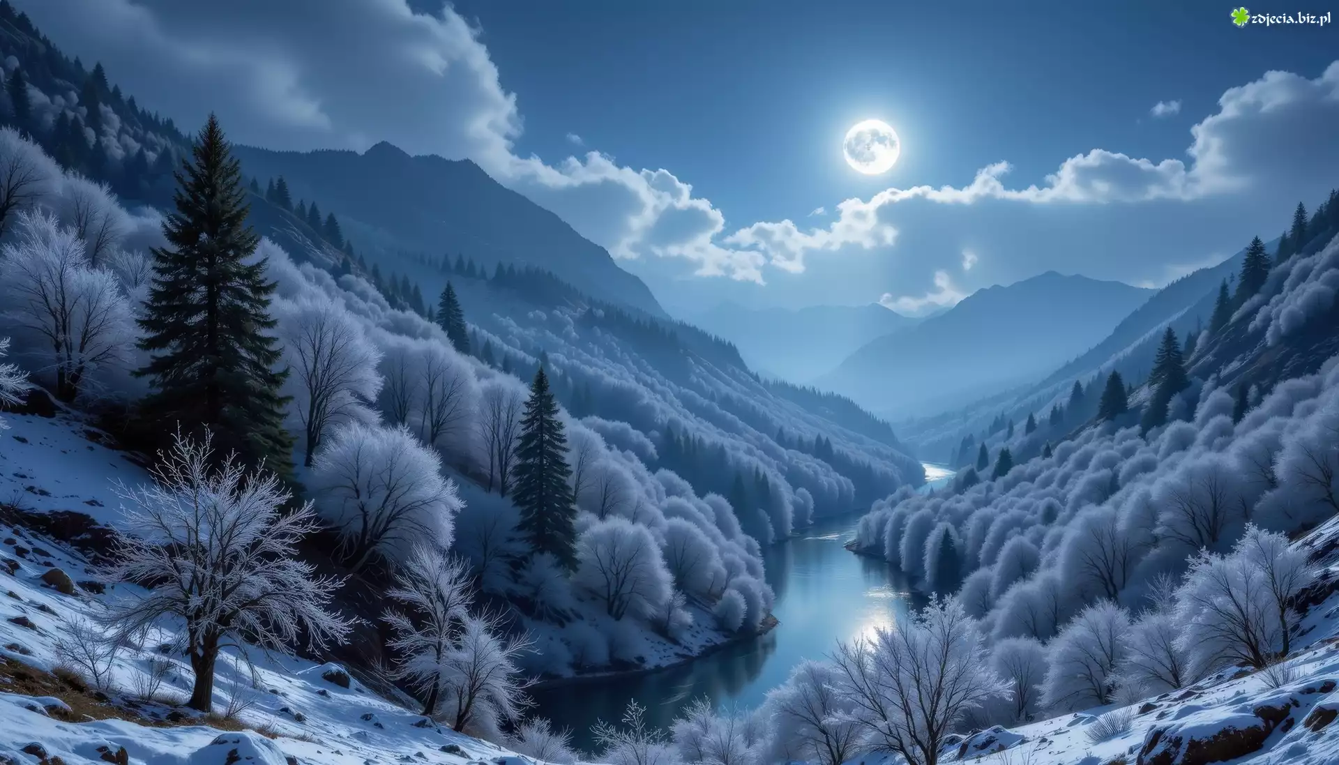 Zdjęcie Zima, Góry, Las, Oszronione, Drzewa, Rzeka, Śnieg, Noc, Księżyc, Grafika AI
