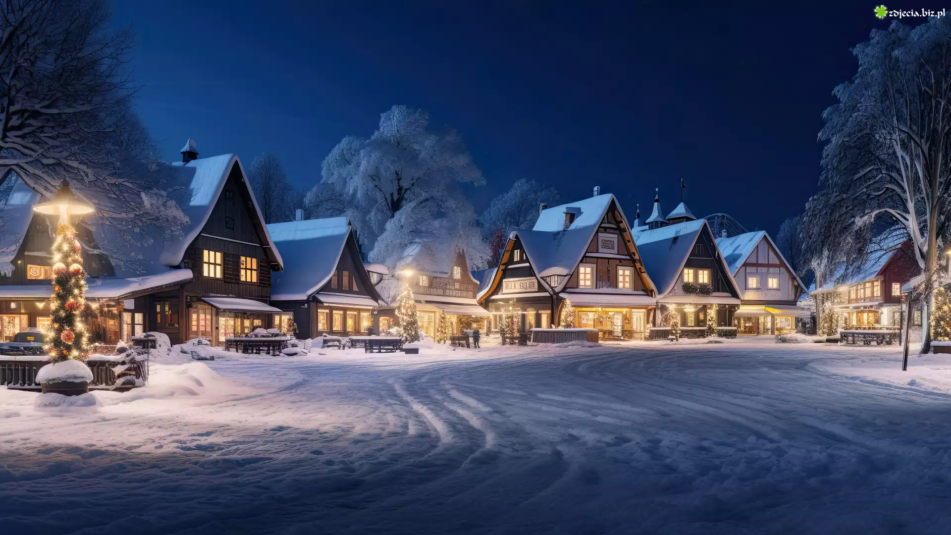 Zdjęcie Zima, Domy, Światła, Śnieg, Drzewa, Noc