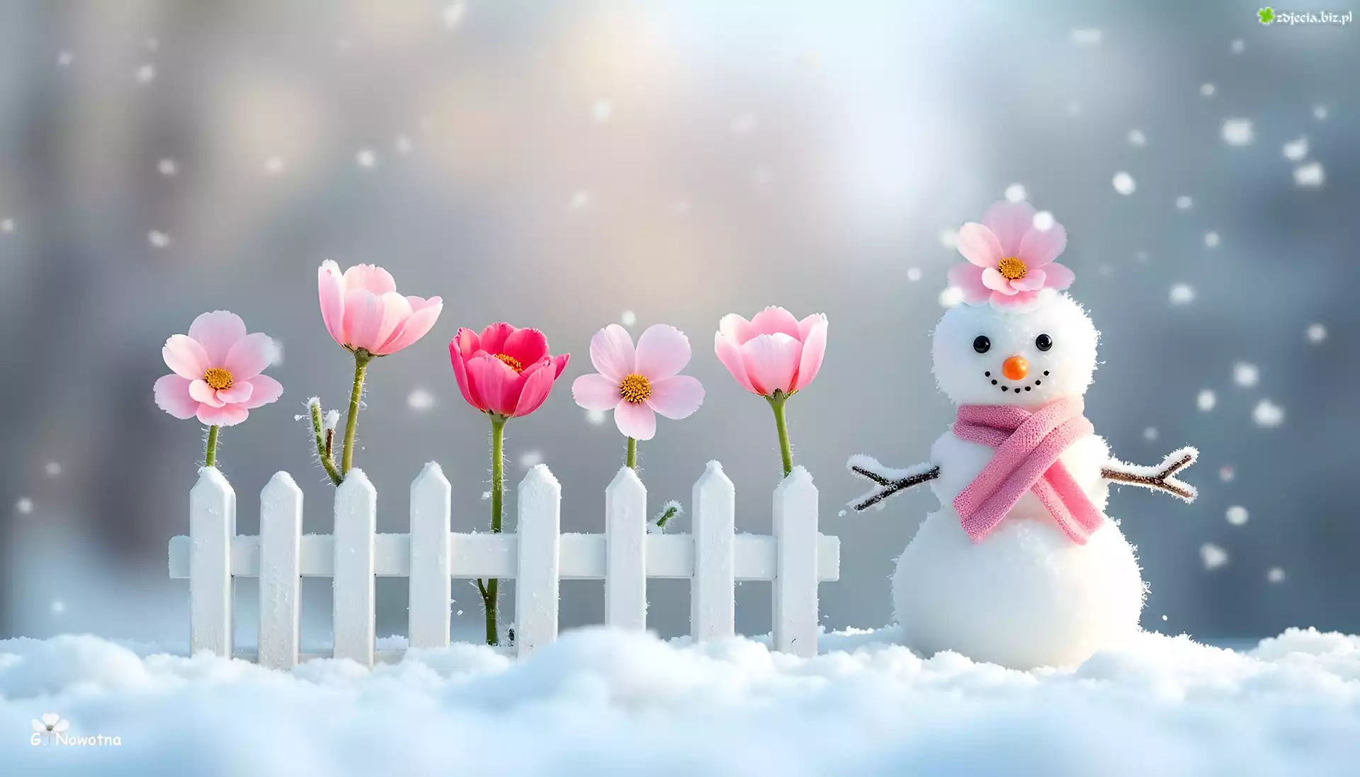 Zdjęcie Bałwan, Śnieg, Płotek, Kwiaty, Grafika
