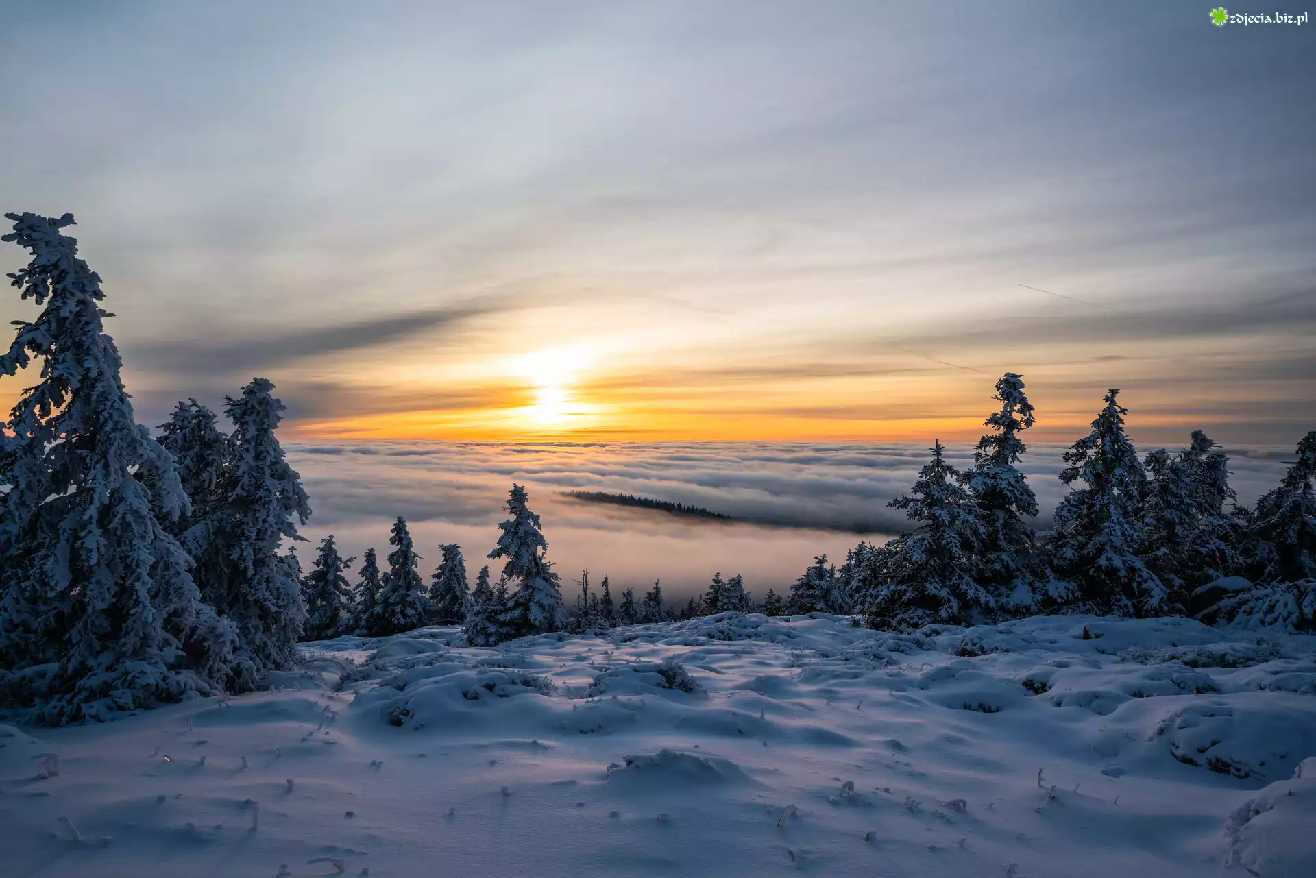 Zdjęcie Zima, Zachód słońca, Chmury, Ośnieżone, Drzewa, Pole, Śnieg
