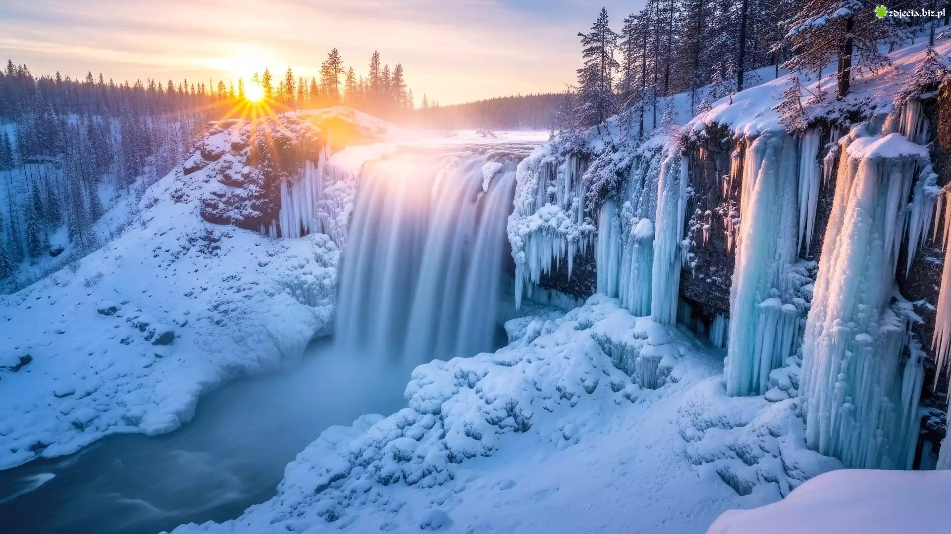 Zdjęcie Zima, Zachód słońca, Skały, Wodospad, Rzeka, Drzewa, Śnieg