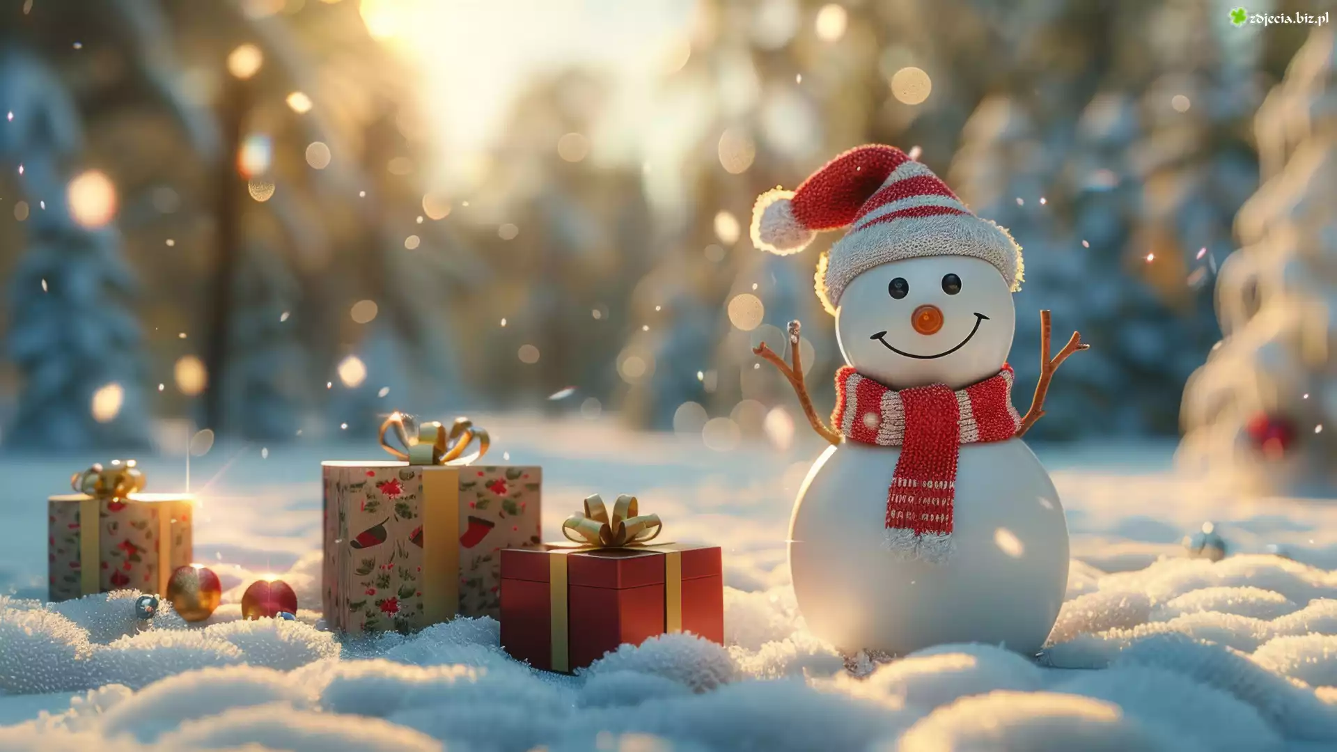 Zdjęcie Zima, Bałwan, Uśmiech, Czapka, Szalik, Prezenty, Bombki, Śnieg