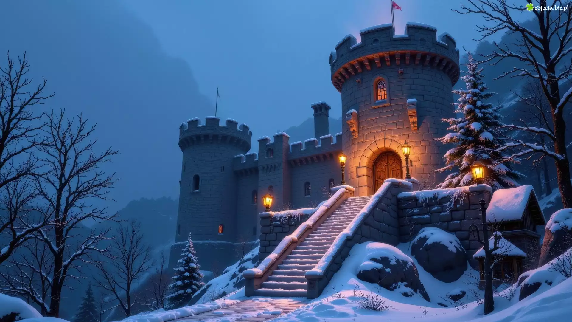 Zdjęcie Zima, Noc, Zamek, Śnieg, Rozświetlone, Latarnie, Drzewa