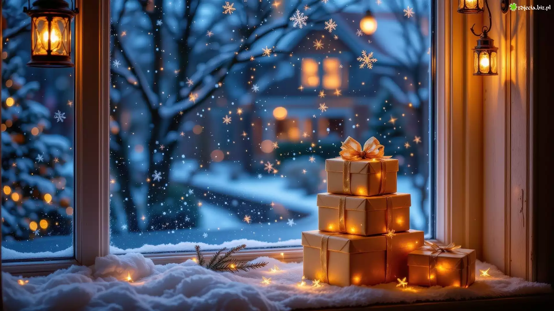 Zdjęcie Okno, Śnieg, Zima, Prezenty, Lampiony