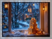 Zdjęcie, Okno, Śnieg, Zima, Prezenty, Lampiony