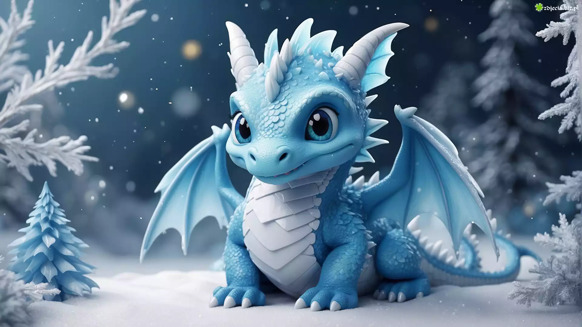 Zdjęcie Niebieski, Smok, Zima, Śnieg, Gałązki, Choinka, 2D