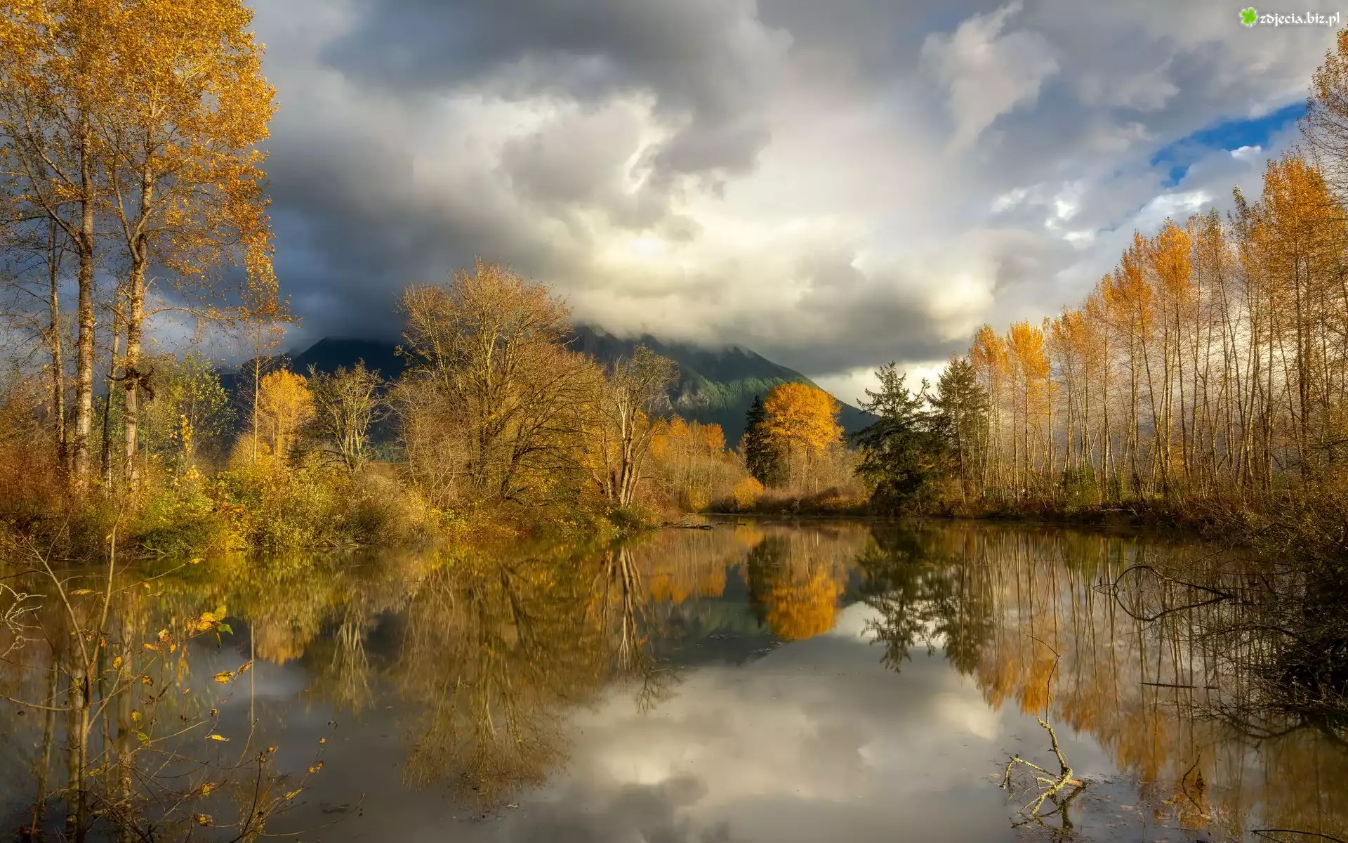 Zdjęcie Jesień, Drzewa, Staw, Dolina, Snoqualmie Valley, Góra, Mount Si, Chmury, Stan Waszyngton, Stany Zjednoczone |