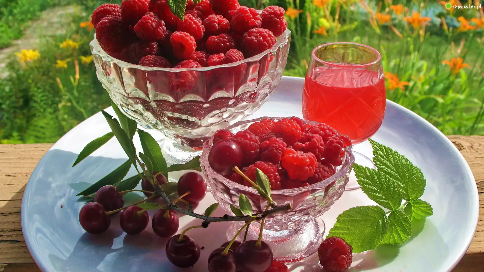 Zdjęcie Sok, Maliny, Wiśnie, Wazon, Biały, Talerz