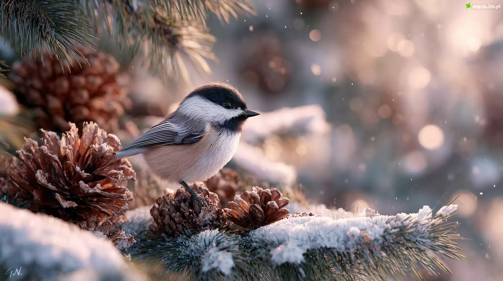 Zdjęcie Sikorka czarnogłówka, Szyszki, Sosna, Zima, Grafika AI