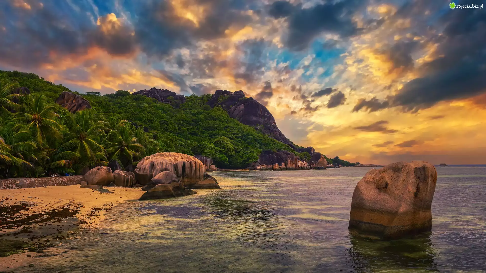 Zdjęcie Seszele, Wyspa, La Digue, Morze, Plaża, Anse Source dArgent Beach, Zachód słońca, Palmy, Skały, Góry |