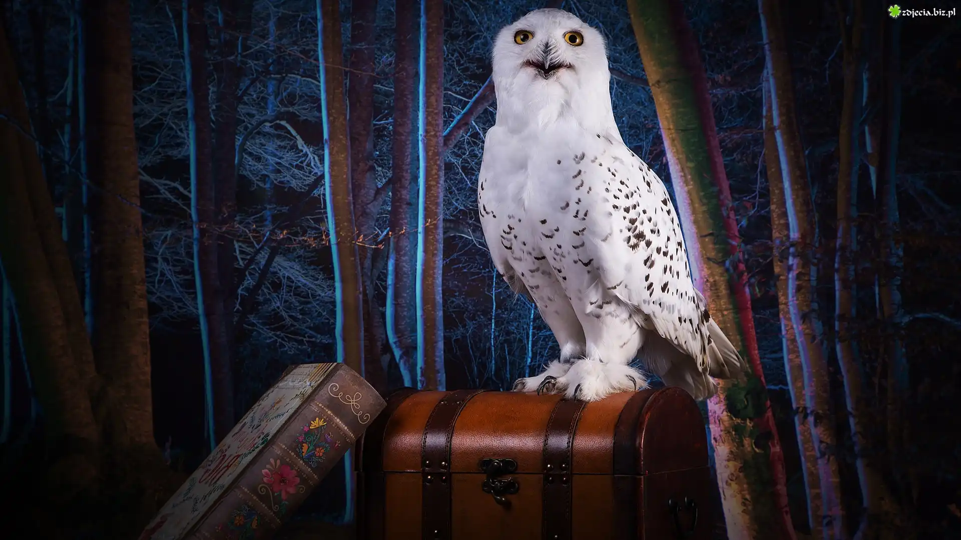 Zdjęcie Sowa śnieżna, Książka, Kufer, Drzewa
