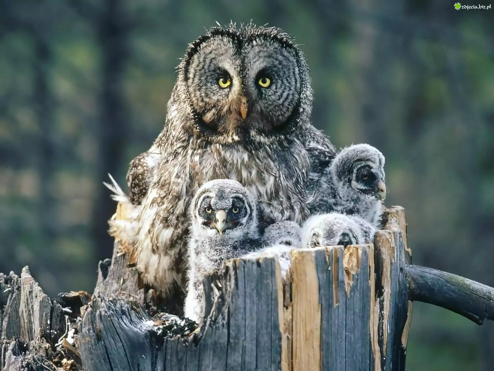 Zdjęcie, Sowa, Sówki, Puszczyk mszarny, Pisklęta, Pniak