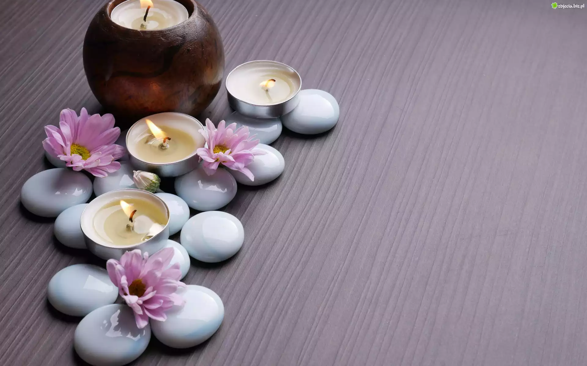 Zdjęcie, SPA, Kamienie, Świece, Kwiaty, Chryzantema