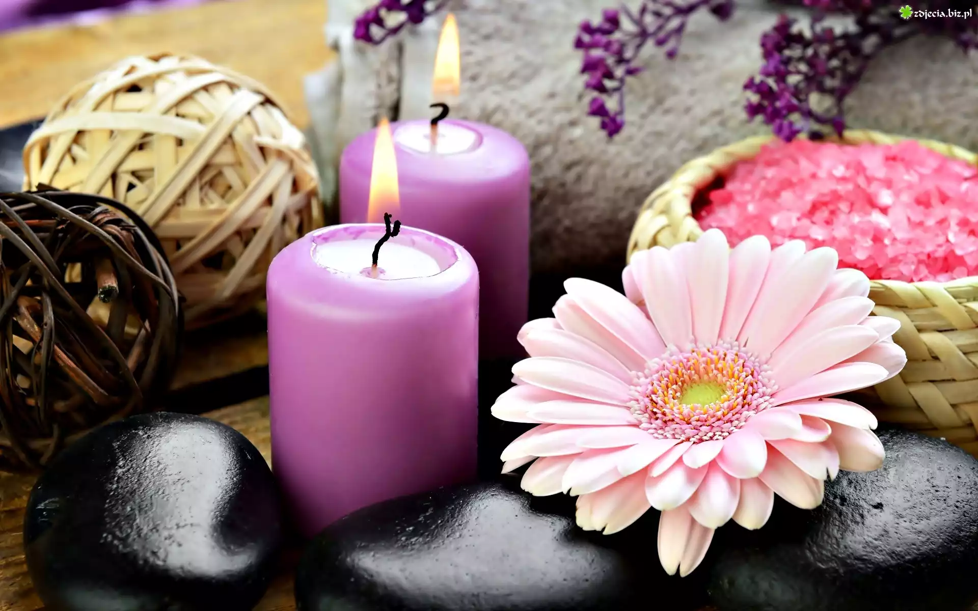 Zdjęcie Kompozycja, Spa, Sól, Morska, Świece, Gerbera, Kamienie