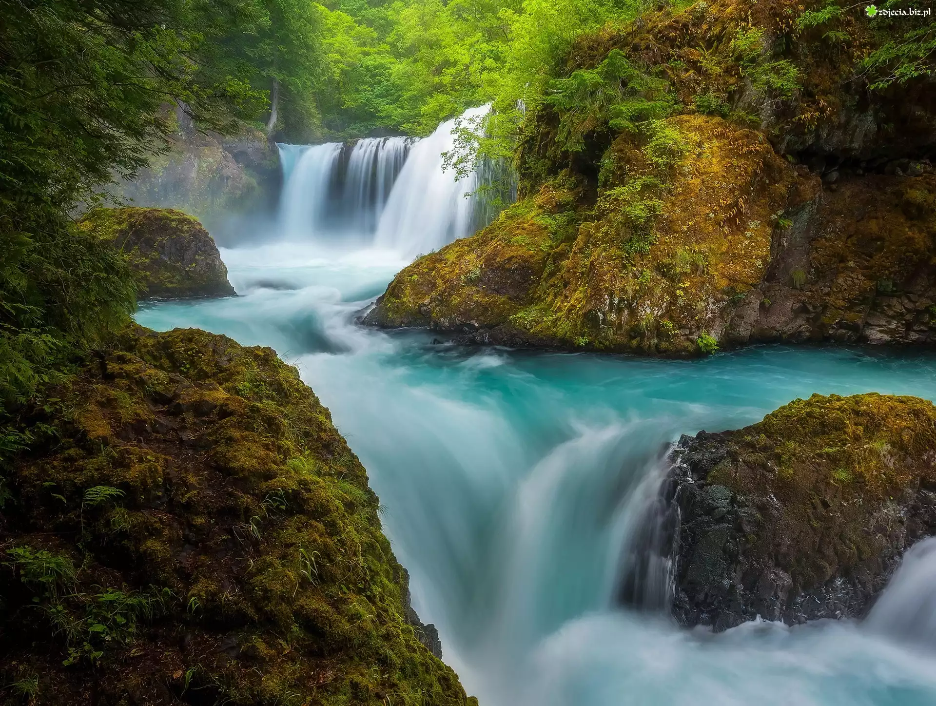 Zdjęcie Rzeka Salmon River, Wodospad Spirit Falls, Hrabstwo Skamania, Stan Waszyngton, Stany Zjednoczone, Skały, Roślinność |