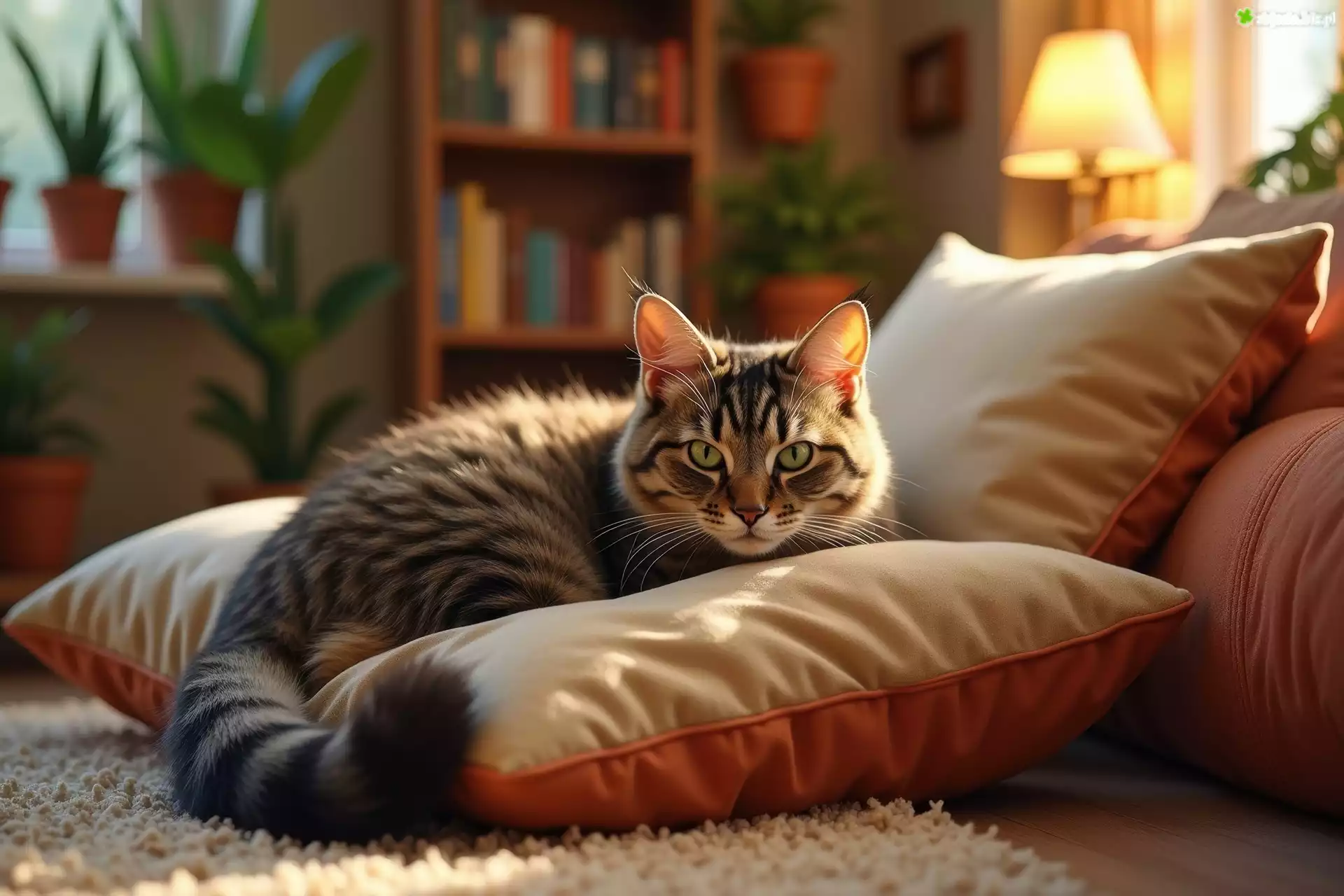 Zdjęcie Kot, Spojrzenie, Poduszki, Pokój, Grafika