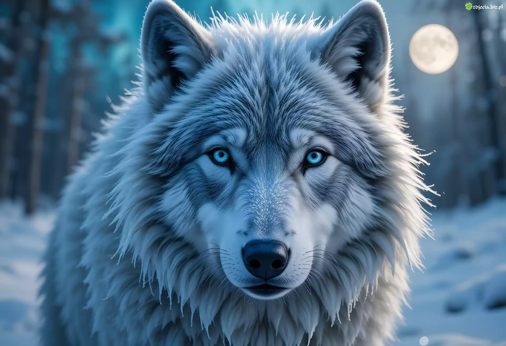 Zdjęcie Wilk, Spojrzenie, Zima, Księżyc, Grafika