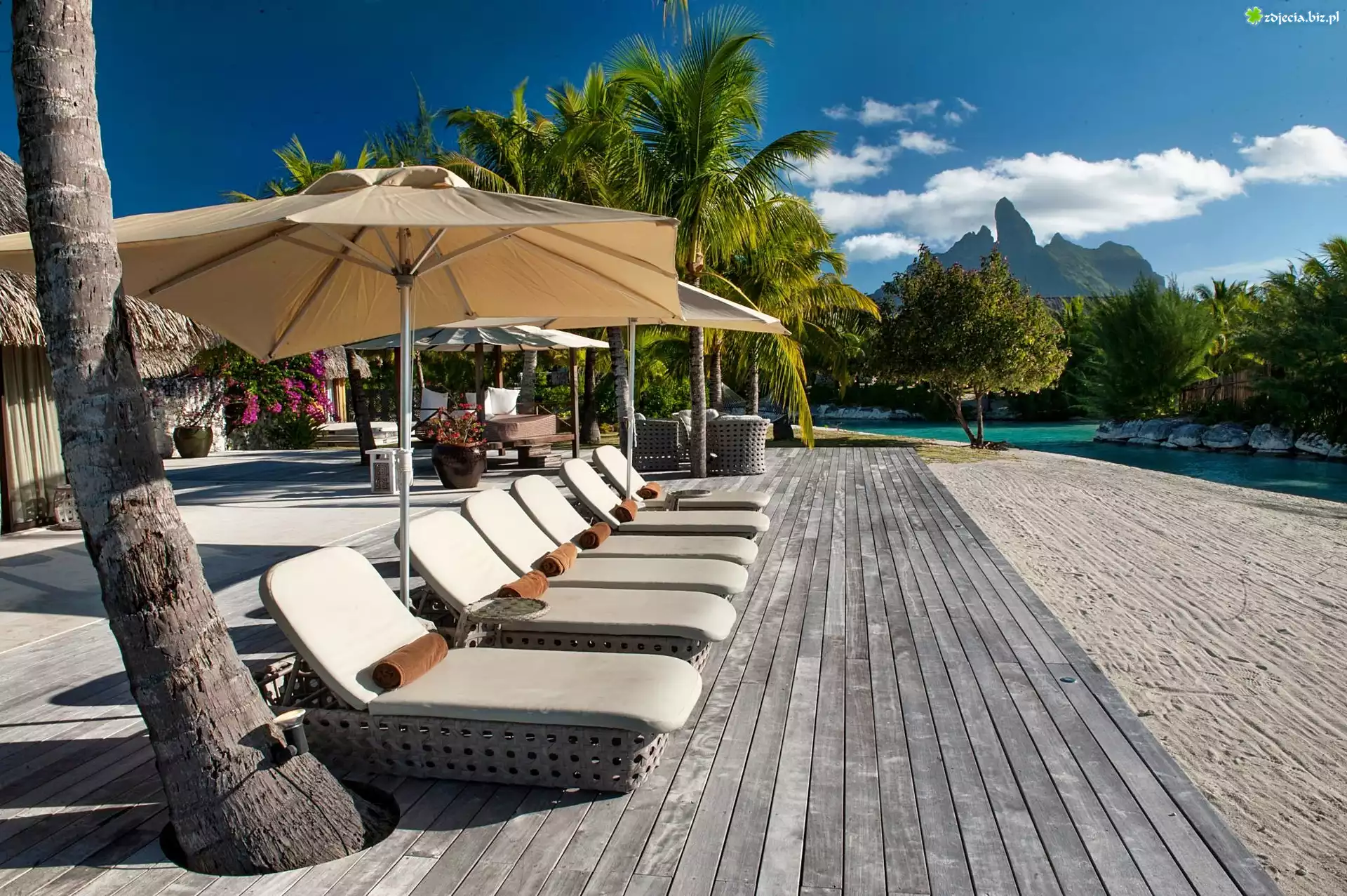 Zdjęcie Polinezja Francuska, Bora Bora, Góra, Leżaki, Parasole, Palmy, Wakacje