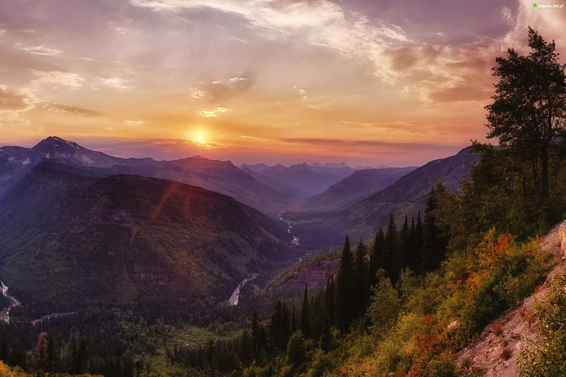 Zdjęcie, Stany Zjednoczone, Stan Montana, Park Narodowy Glacier, Góry, Las, Zachód słońca
