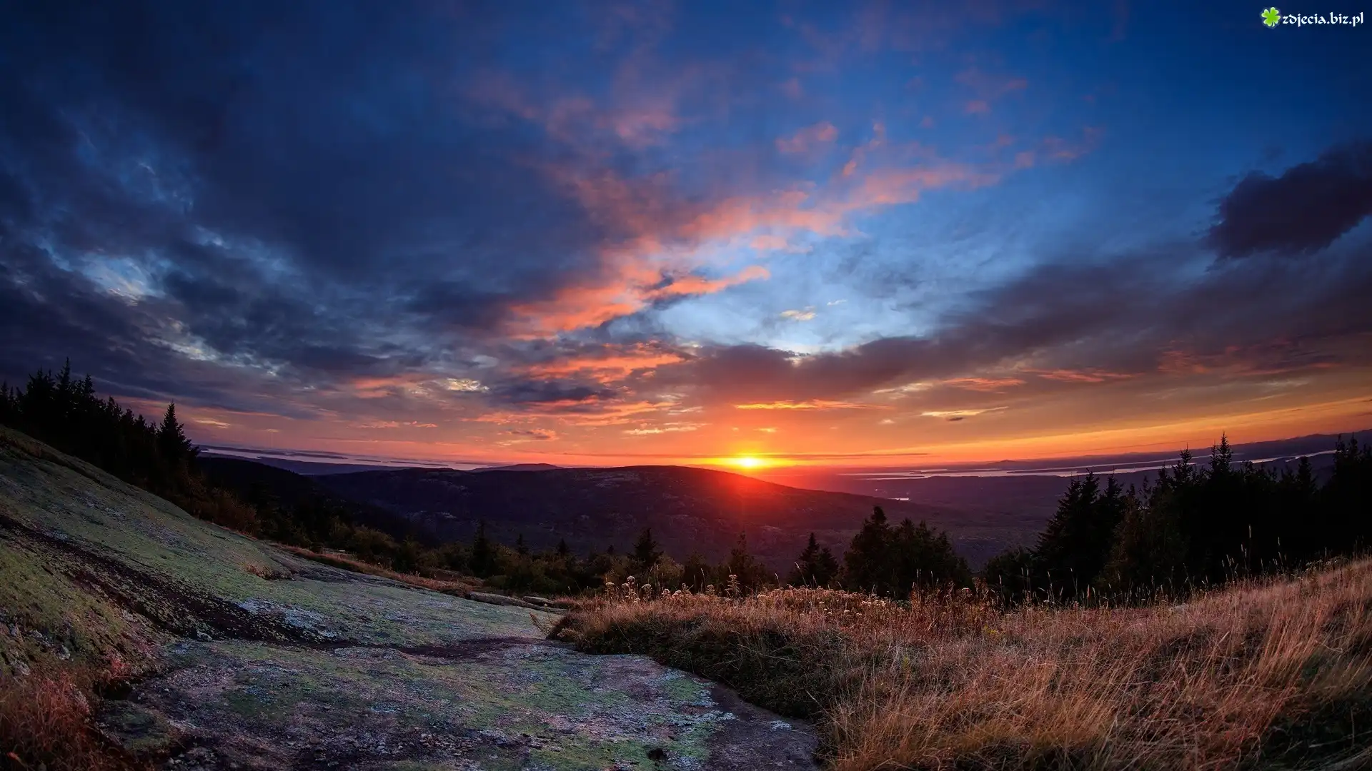Zdjęcie Stany Zjednoczone, Stan Maine, Park Narodowy Acadia, Zachód słońca, Drzewa, Wzgórza