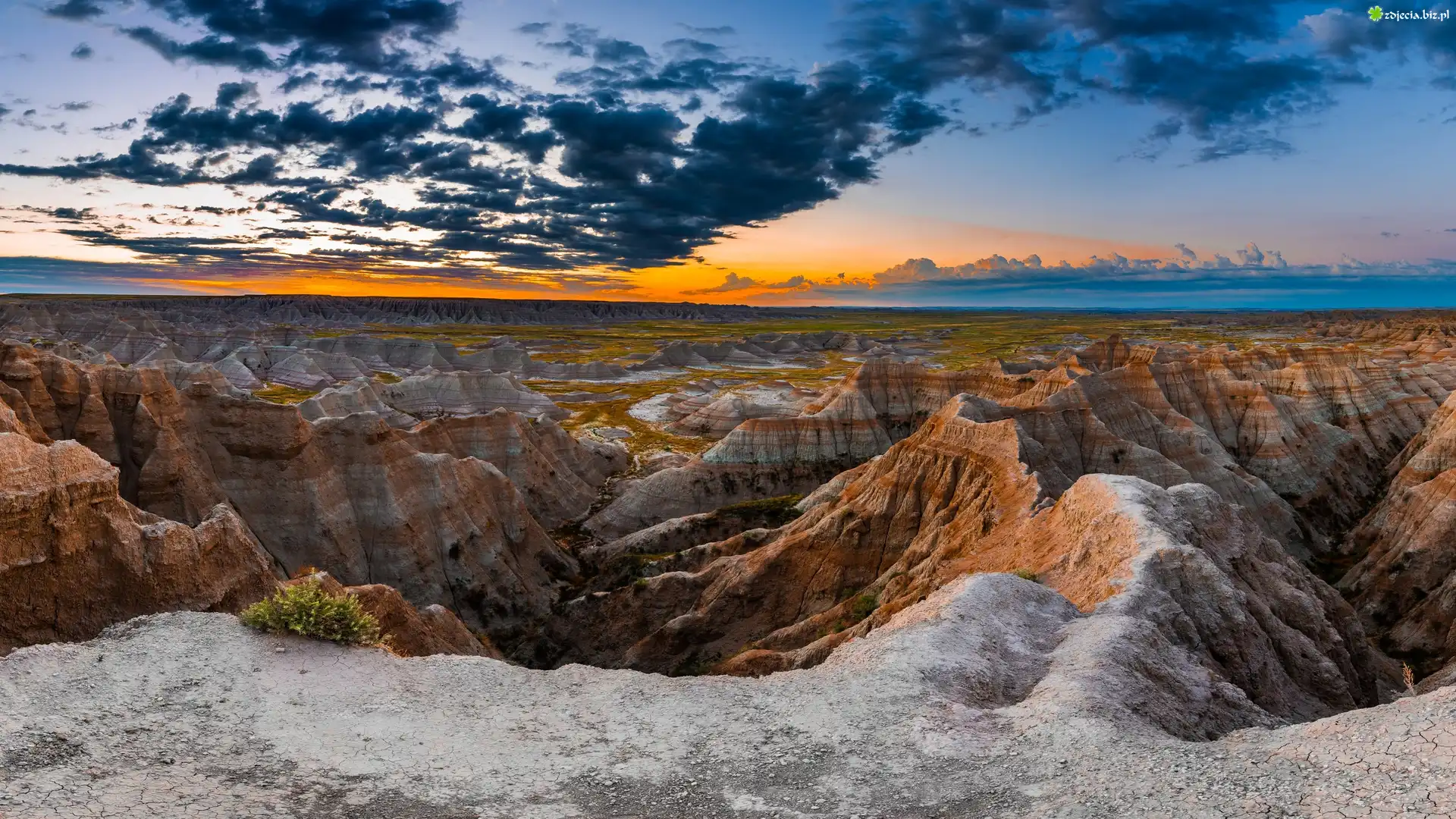 Zdjęcie, Stany Zjednoczone, Stan Dakota Południowa, Park Narodowy Badlands, Skały, Niebo, Chmury