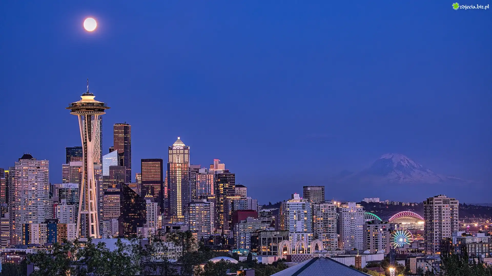 Zdjęcie Stany Zjednoczone, Stan Waszyngton, Seattle, Wieża, Space Needle, Wieżowce, Księżyc, Pełnia
