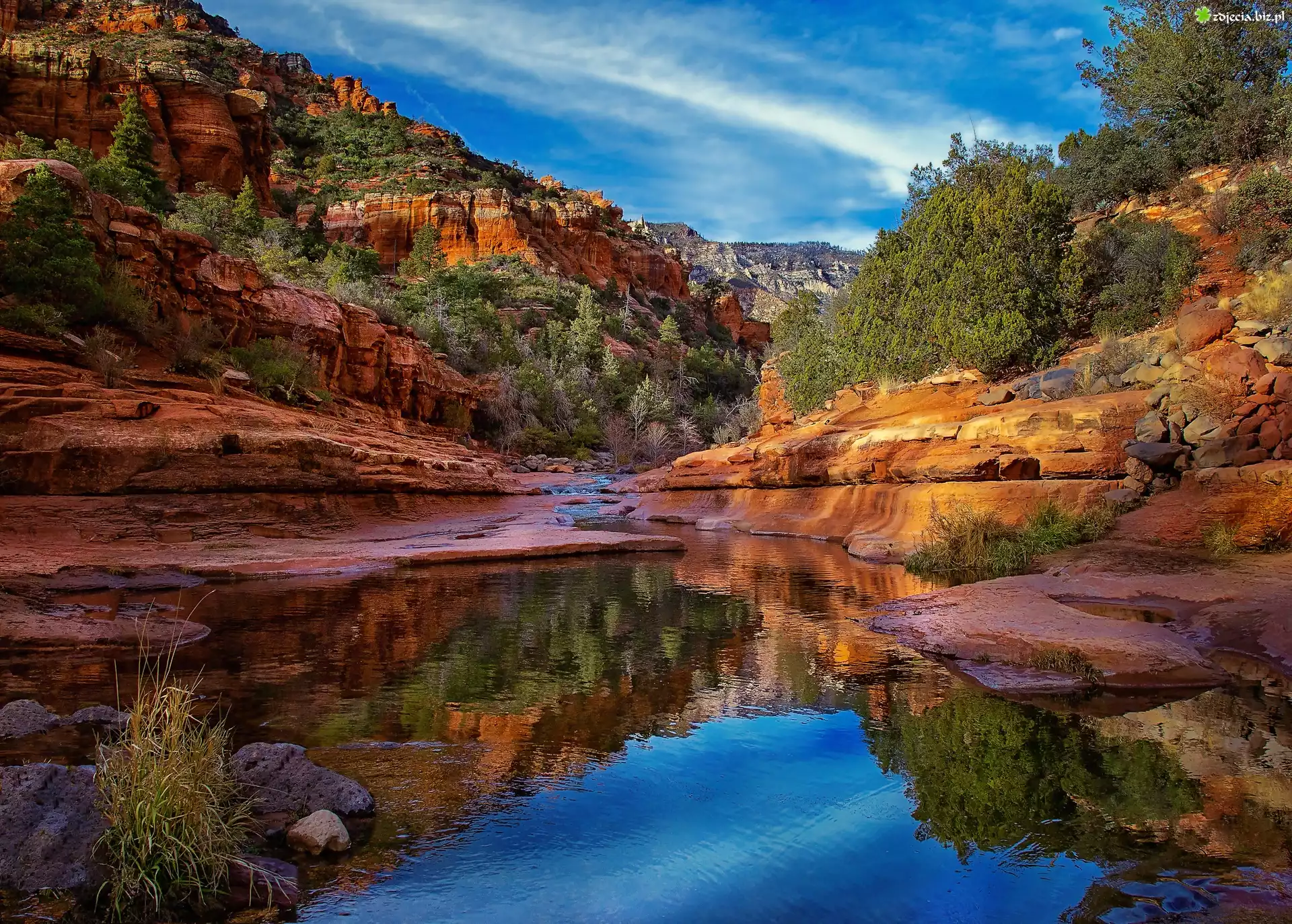 Zdjęcie Stany Zjednoczone, Stan Arizona, Park stanowy Slide Rock, Kanion, Rzeka, Skały, Drzewa